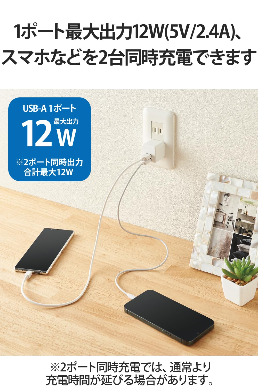 ■1ポート最大出力12W(5V/2.4A)、合計最大出力12W(5V/2.4A)です。