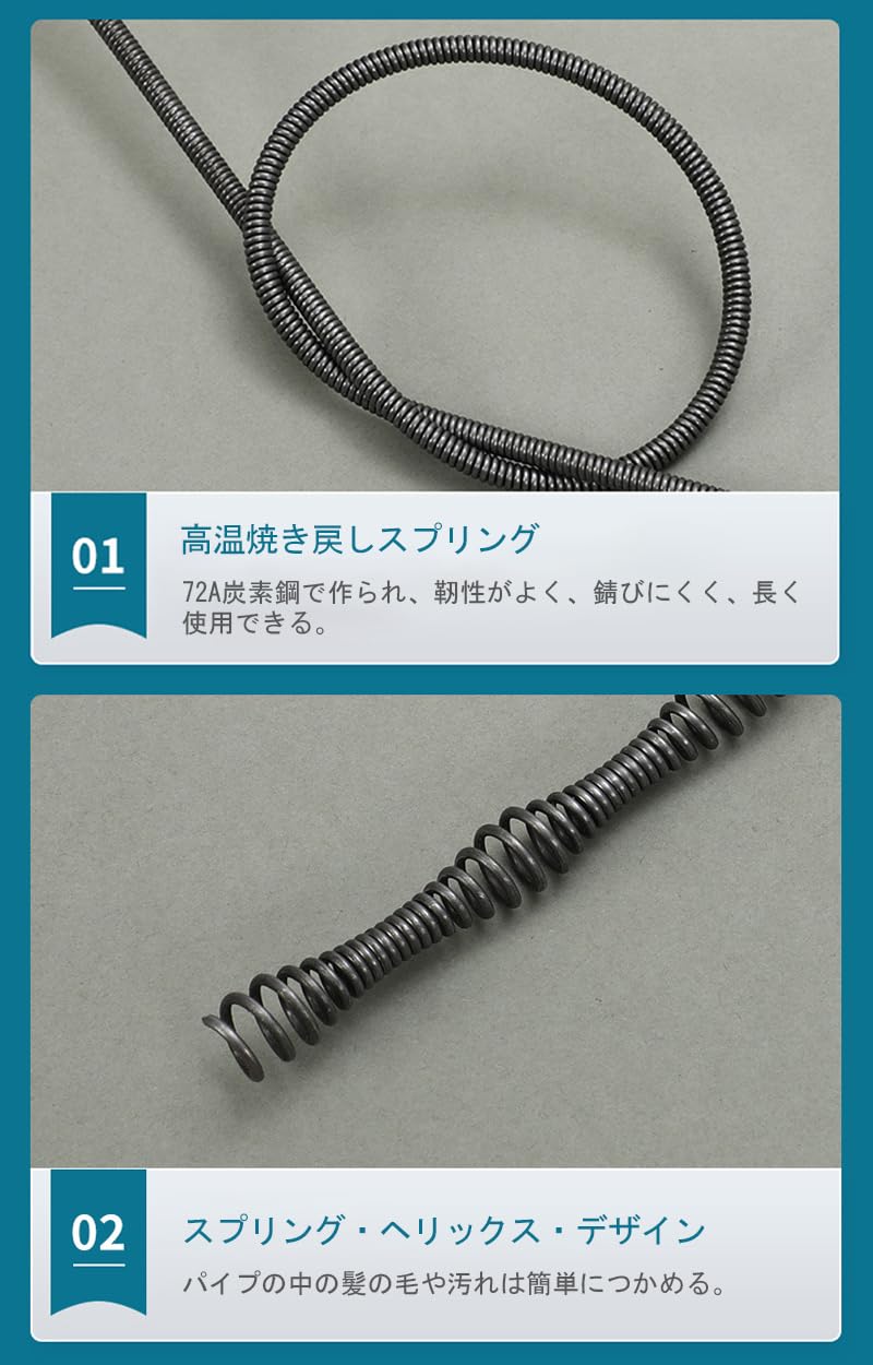 【深層クリーニング】製品は10メートル/5メートルの長いワイヤーを備えており、排水管の深層を簡単に清掃できます。月に1度または半年に1度の排水管の全面的なクリーニングをお勧めします。定期的な清掃により、詰まりの問題を効果的に予防し、家庭の健康に全方位で配慮します。