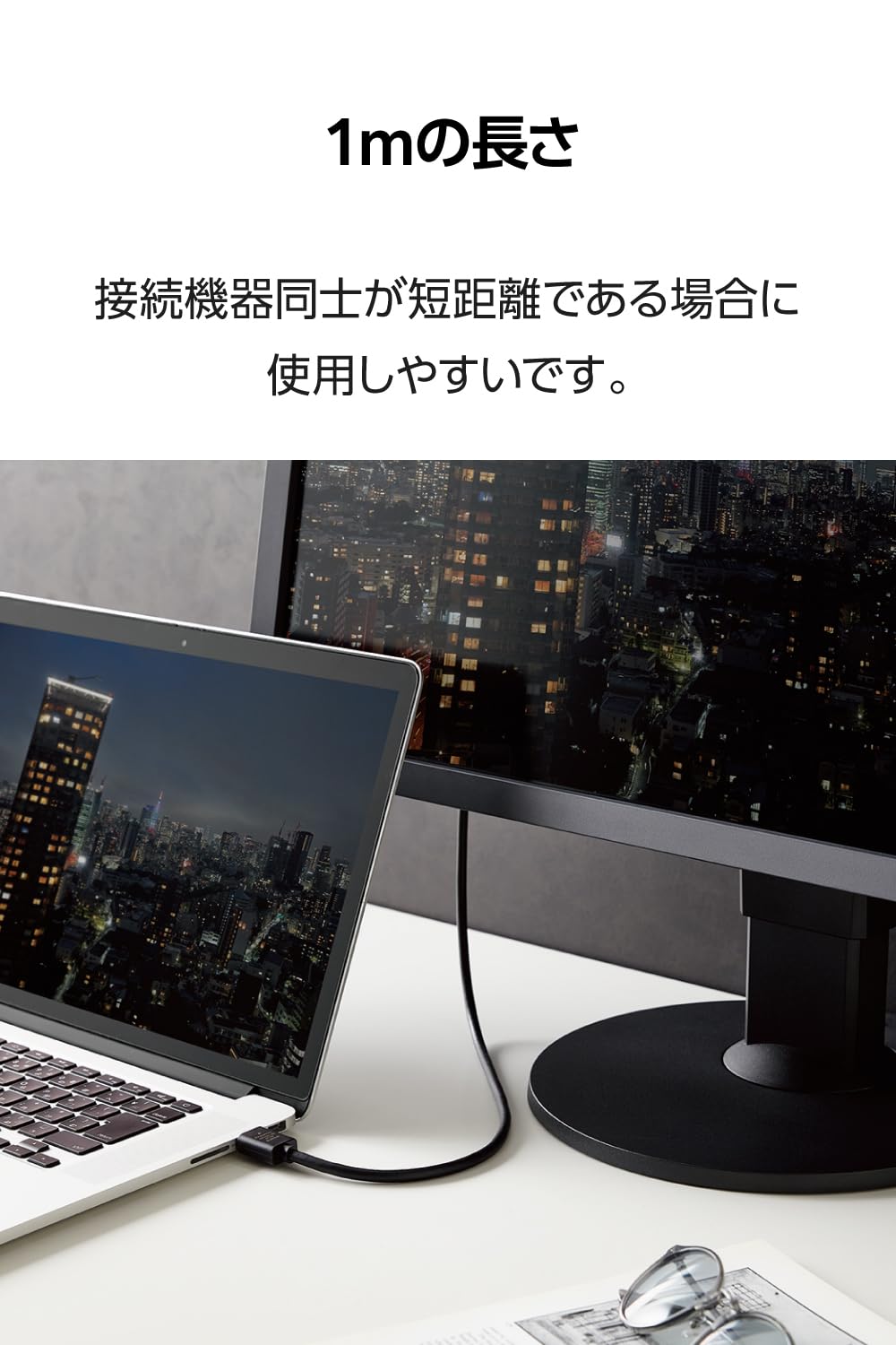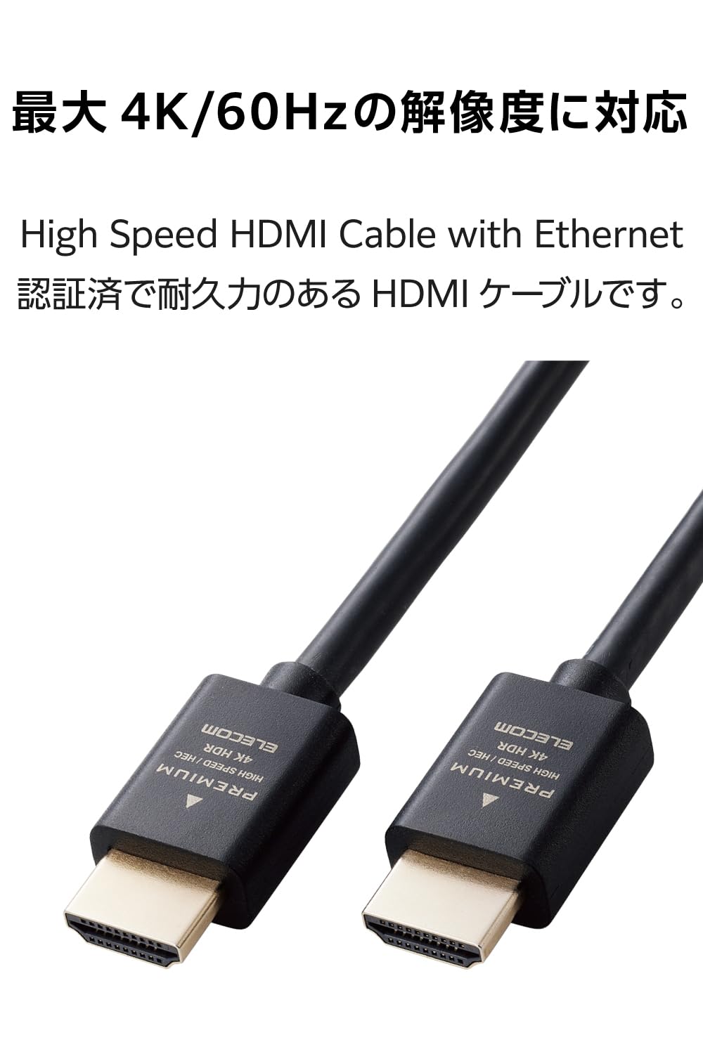 最大4K/60Hzの解像度に対応したHDMIケーブルです。High Speed HDMI Cable with Ethernet認証済みで、映像信号と音声信号に加え、100Mbpsのイーサネット通信を実現します。