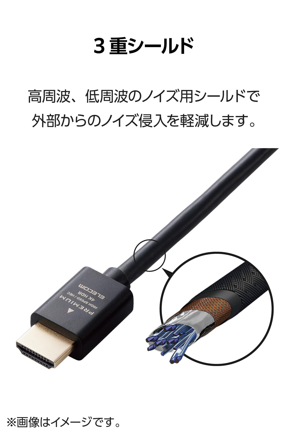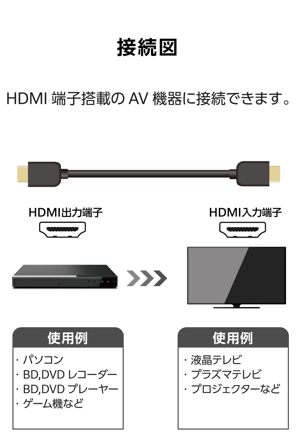 ■対応機種:HDMI(タイプA・19ピン)側:HDMI入力端子を持つ液晶テレビ、プラズマテレビ、プロジェクター等、HDMI(タイプA・19ピン)側:HDMI出力端子を持つAV機器、ゲーム機等 ■規格:Premium High Speed HDMI Cable with Ethernet (HDMI 2.0)認証 ■コネクタ形状1:HDMIプラグ(タイプA・19ピン) ■コネクタ形状2:HDMIプラグ(タイプA・19ピン) ■ケーブルタイプ:スタンダード ■伝送速度:18Gbps ■対応解像度:最大4K(3840×2160px)/60Hz ■シールド方法:3重シールド ■プラグメッキ仕様:金メッキ ■ケーブル長:約1m ※コネクター含まず ■ケーブル径:約6.0mm ■カラー:ブラック ■パッケージ形態:袋+ステッカー ■環境配慮事項: EU RoHS指令準拠(10物質)、簡易パッケージ