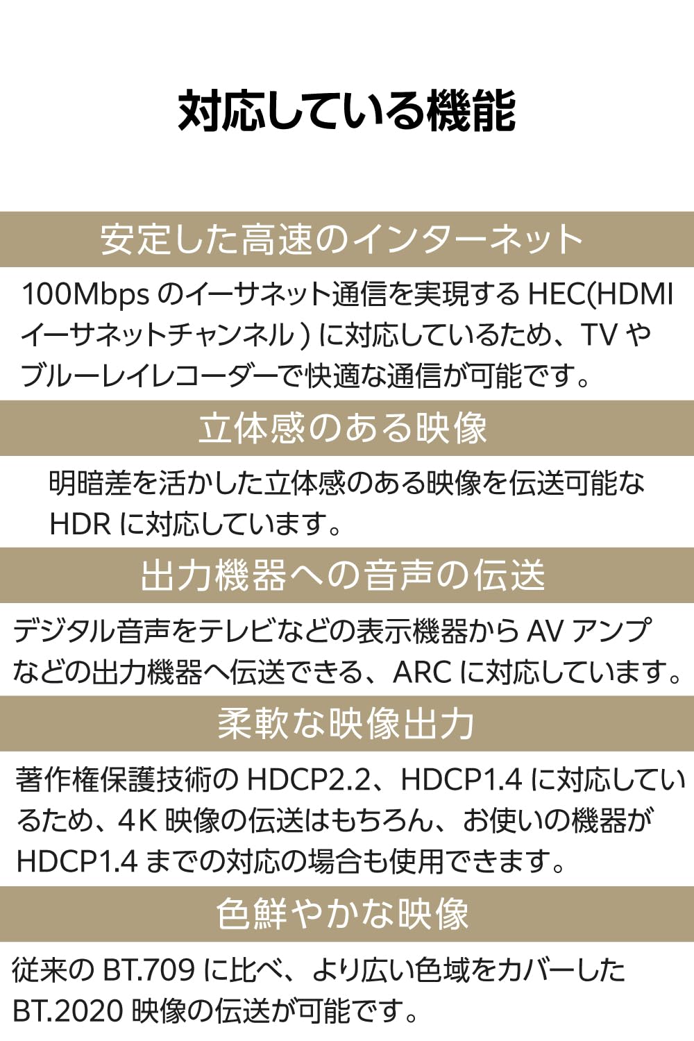 100Mbpsのイーサネット通信を実現する、HEC(HDMIイーサネットチャンネル)に対応しています。