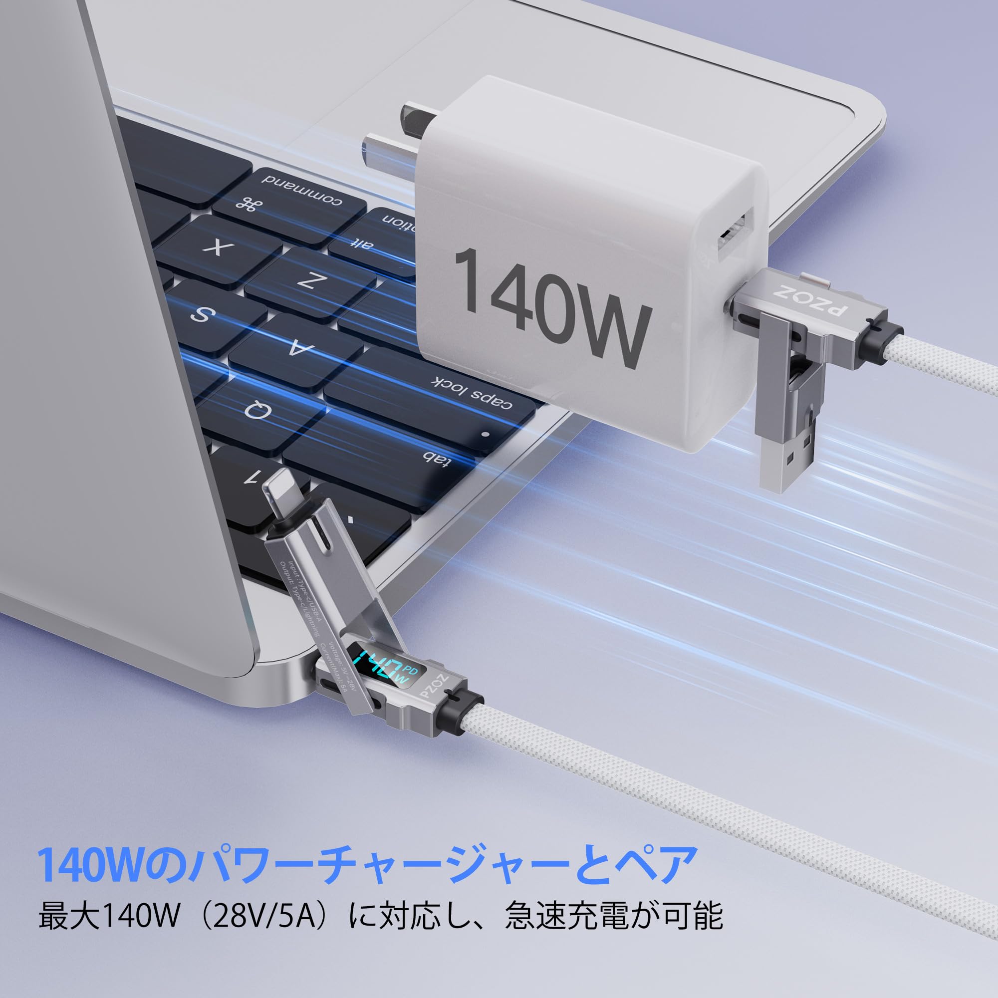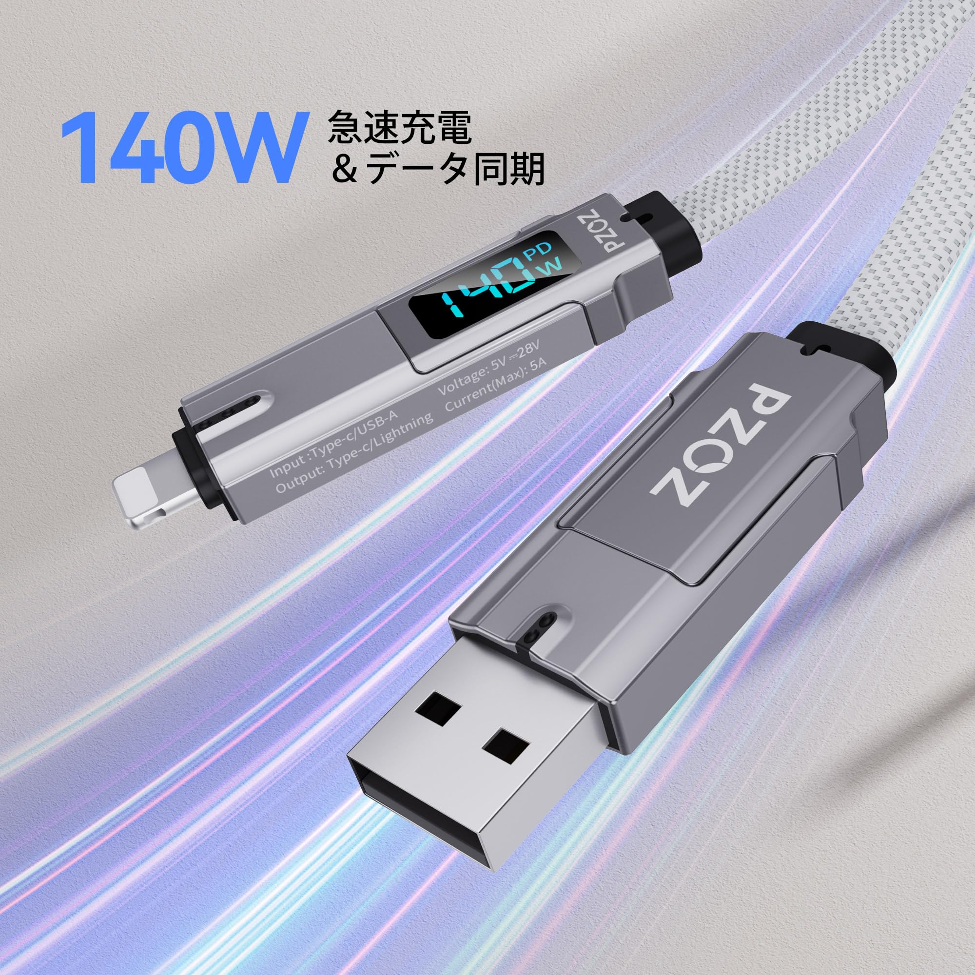 【数量限定】PZOZ 充電ケーブル 4in1 LEDディスプレイ 最大対応140W ケーブル USB C to USB C/タイプc to ライトニング/USB A to USB C/USB A to Lightning 5A 急速充電 PD Macbook/iPhone/iPad/Samsung Galaxy/Google Pixel/Switch 対応