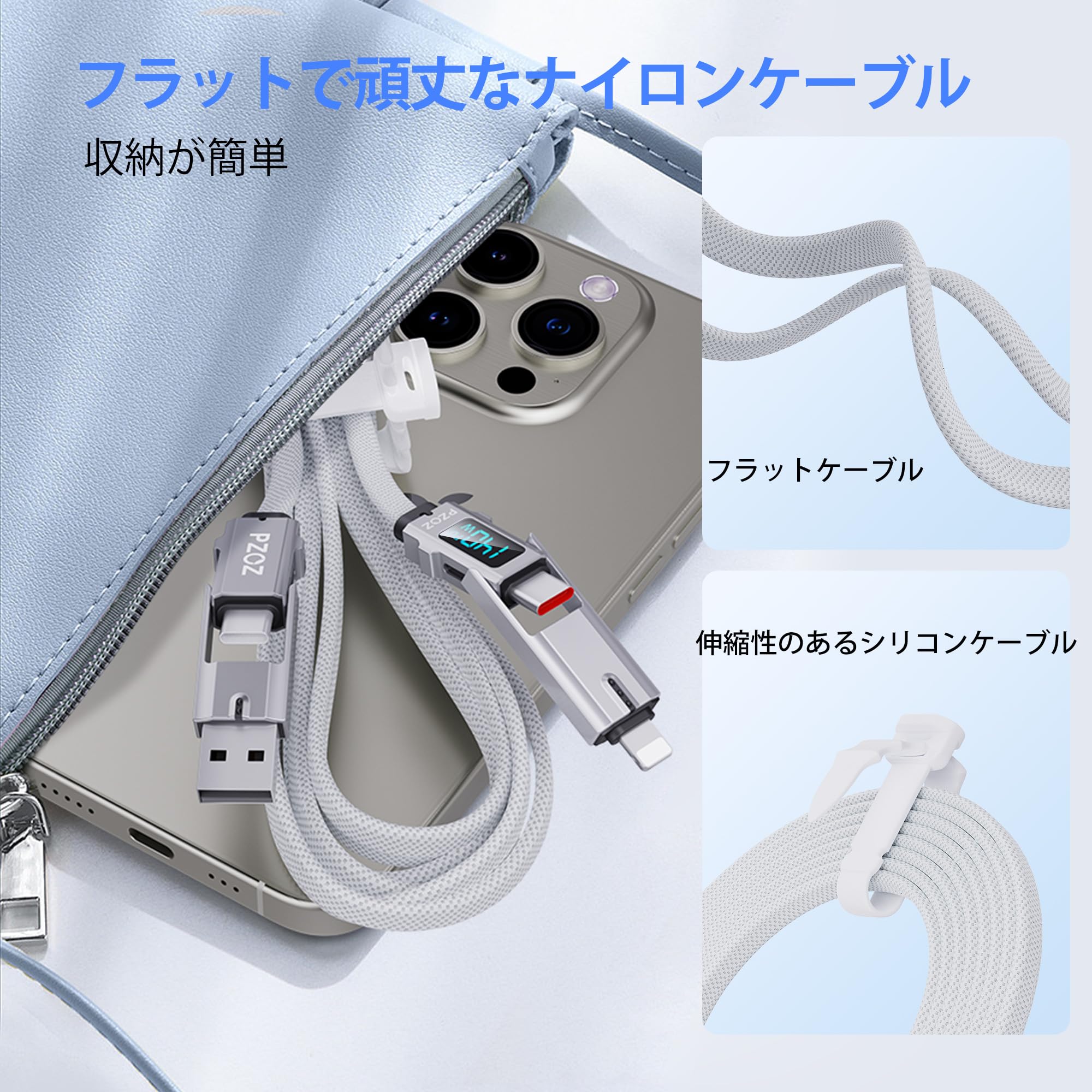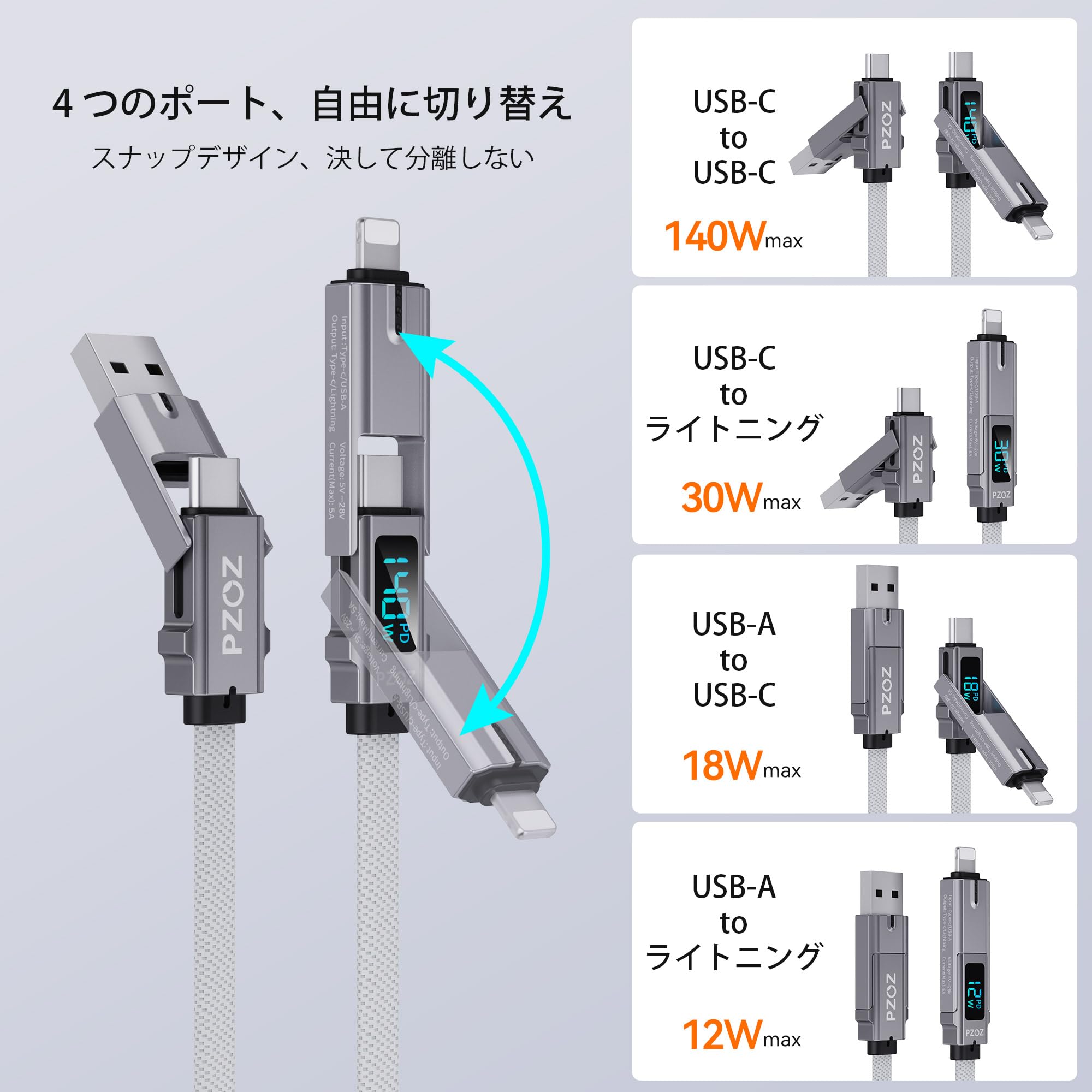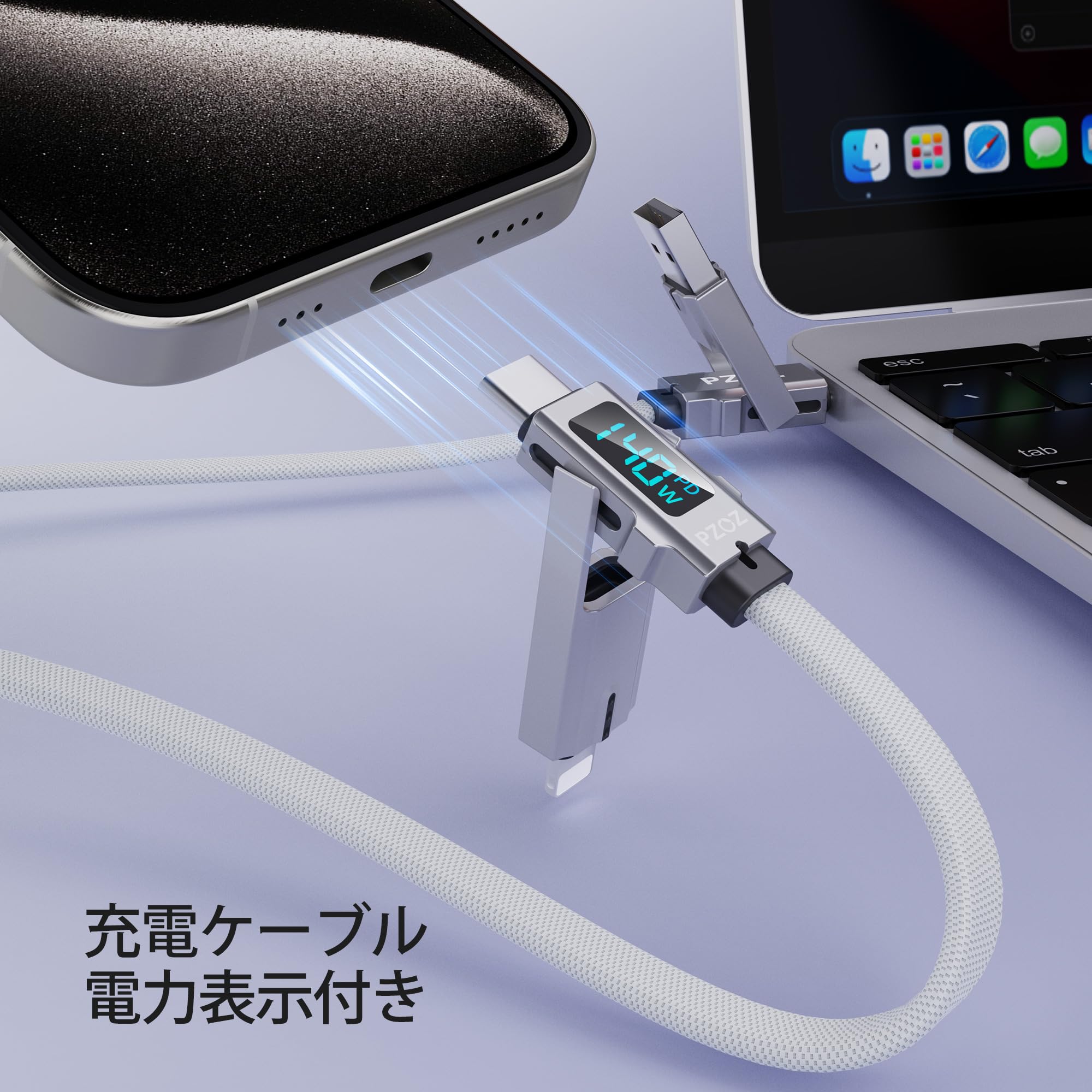 【4-in-1 & LEDディスプレイ】 PZOZのデザインコンセプトはあなたの生活をシンプルにします。 4 つのポートと LED ディスプレイを 1 本のケーブルにまとめています。 USB A to C、USB A to Lightning、USB C to Lightning、USB C to USB C。シンプルさと効率性。