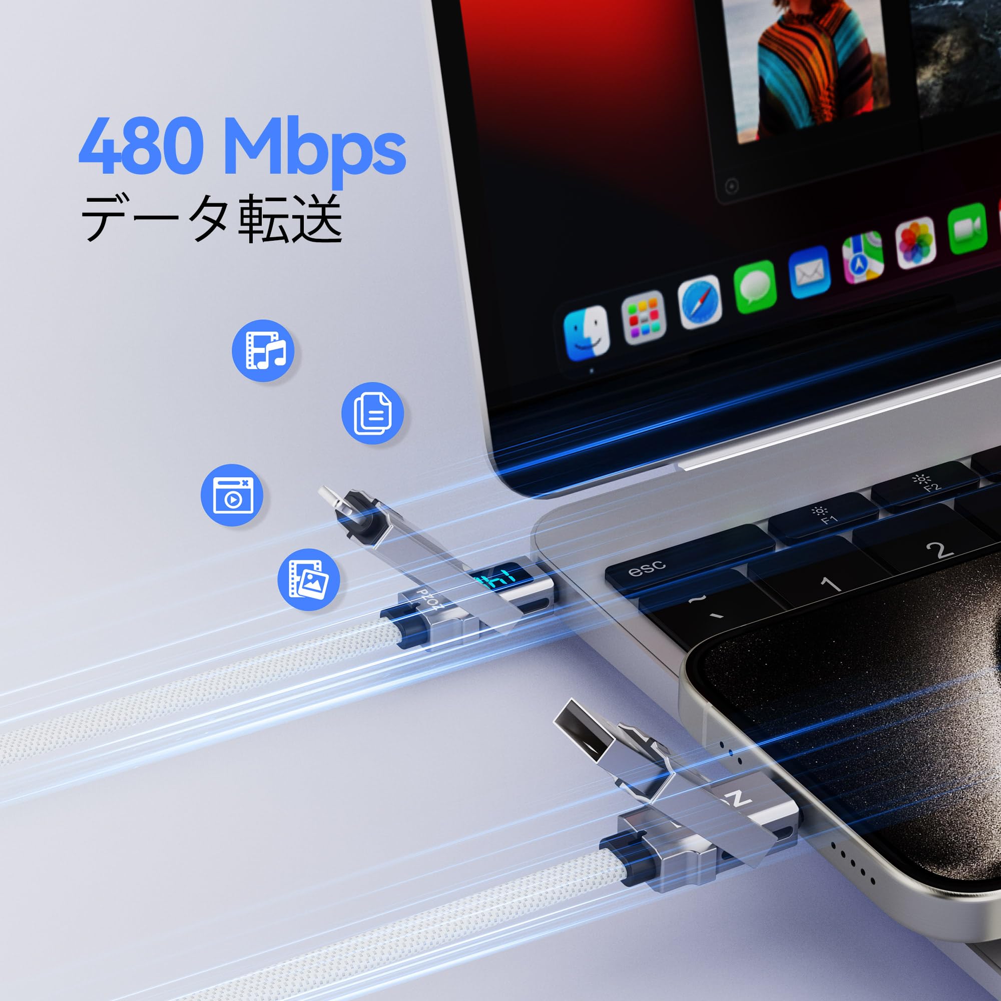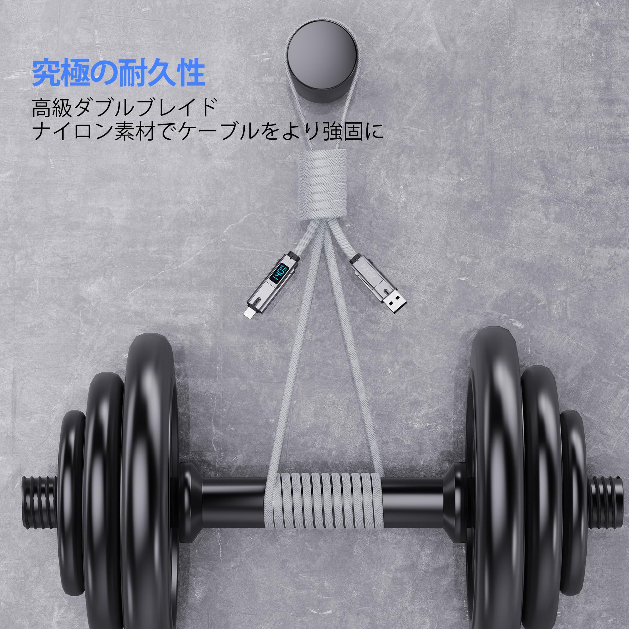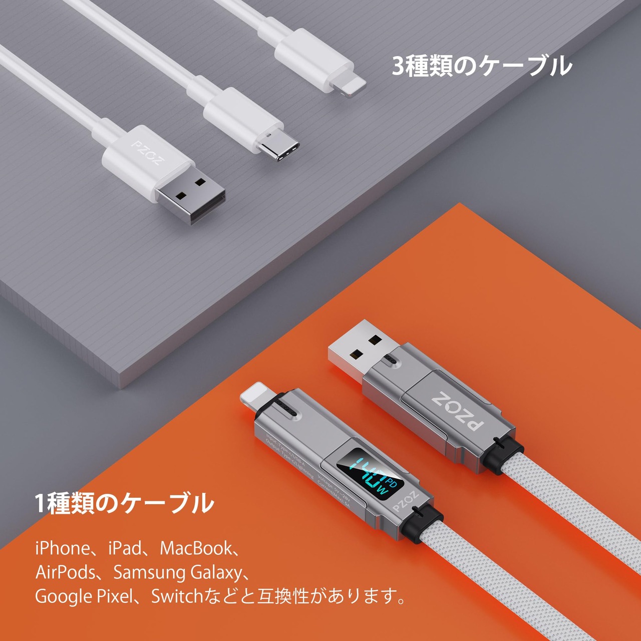 【4-in-1 & LEDディスプレイ】 PZOZのデザインコンセプトはあなたの生活をシンプルにします。 4 つのポートと LED ディスプレイを 1 本のケーブルにまとめています。 USB A to C、USB A to Lightning、USB C to Lightning、USB C to USB C。シンプルさと効率性。