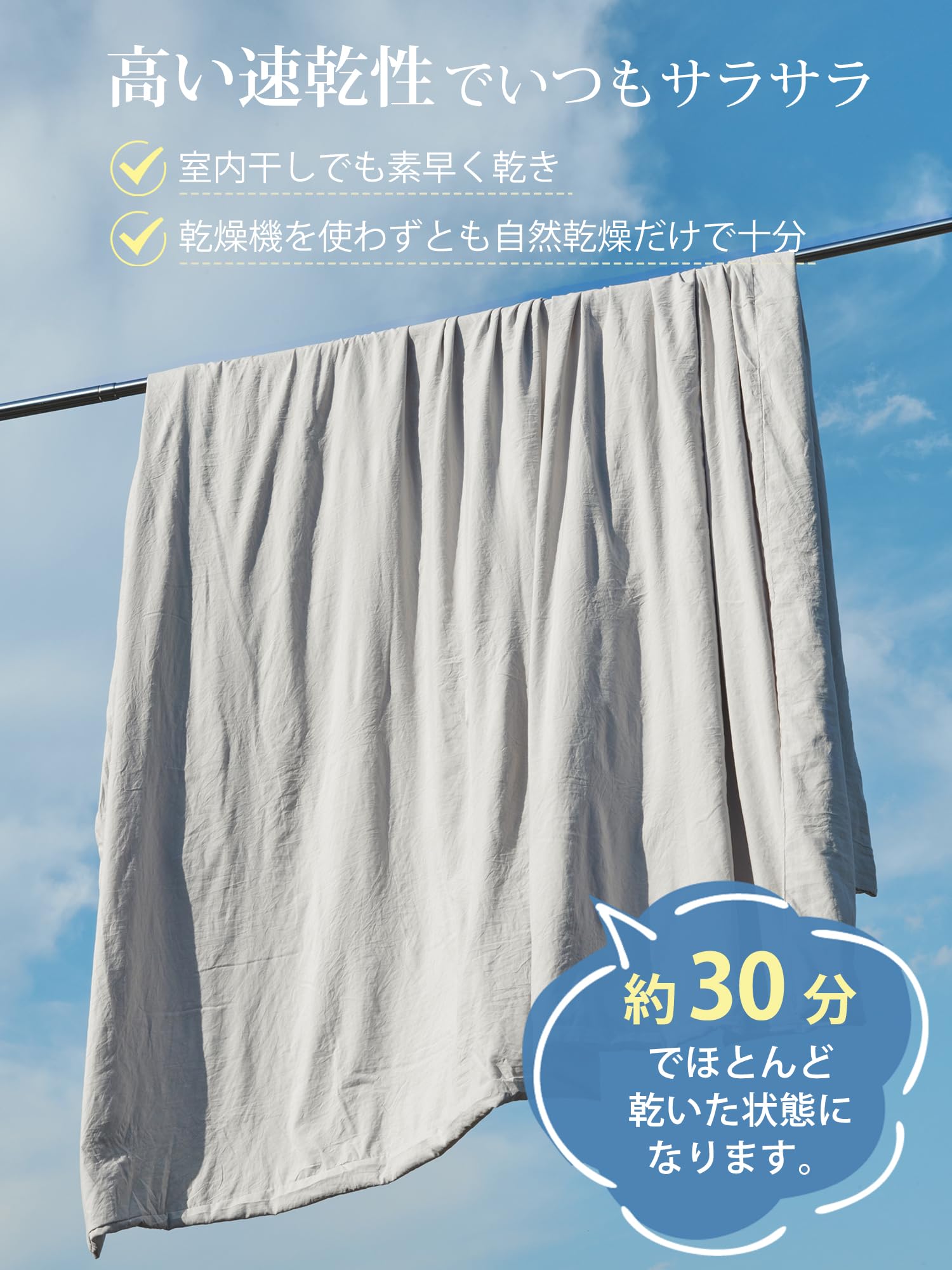 【肌にやさしい生地】薄く軽やかで肌触りの良い材質を使用しています。やわらかな風合いを生かすために、洗いざらしで仕上げました。毛玉やほつれができにくく、使ううちに柔らかくなります。