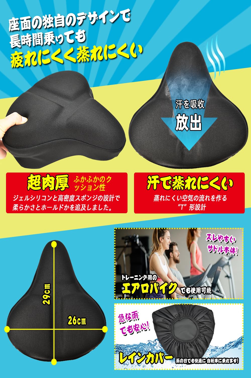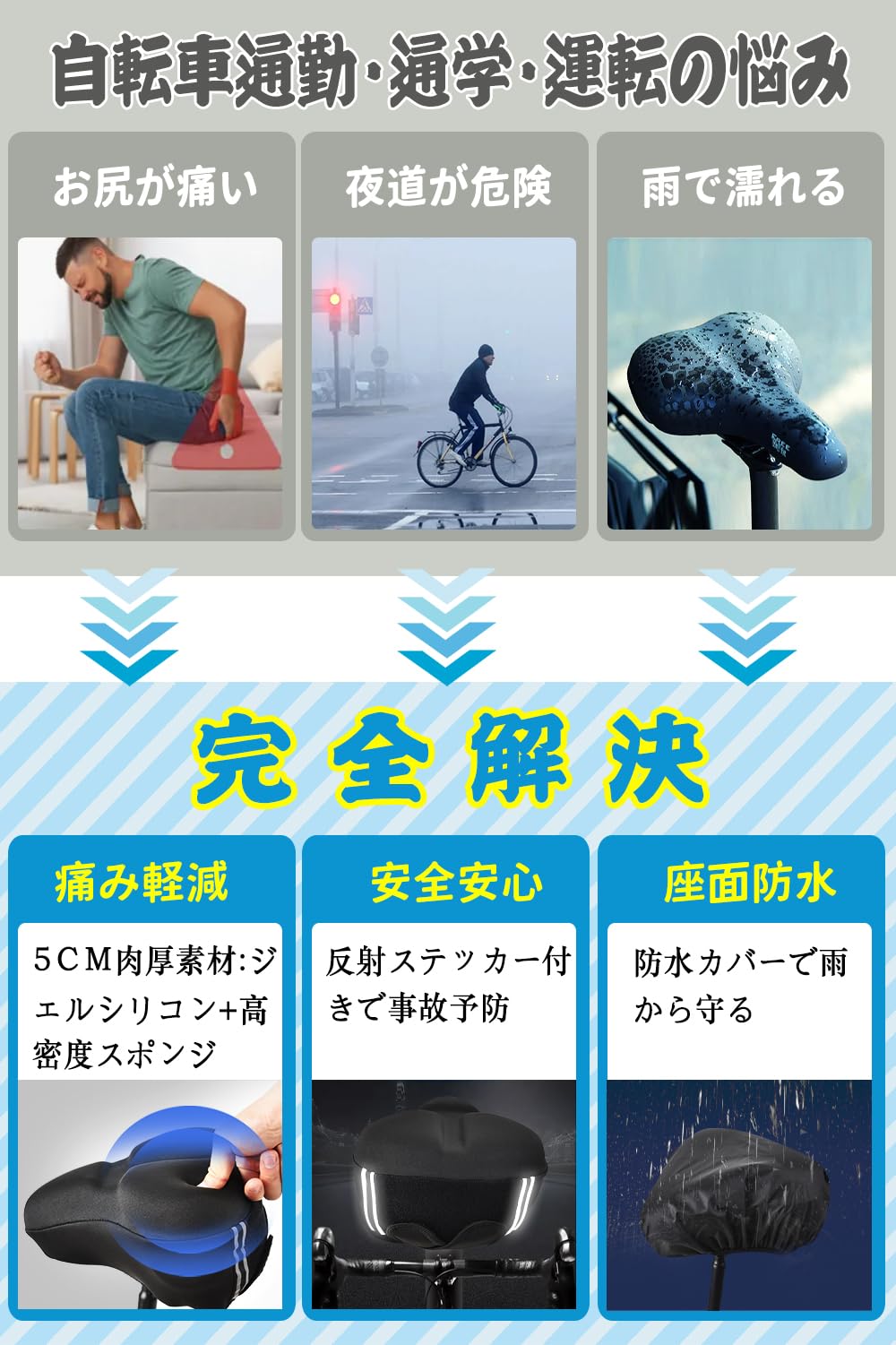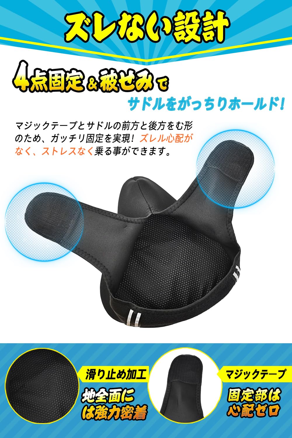 【ズレない・濡れない・蒸れない・夜間の安全】ズレない:マジックテープで3点固定するため固定力が抜群です。ズレて乗りずらいということがありません。サドルとの接着面に滑り止めを加工し、走行時のサドルとカバーのズレを抑えます。濡れない:天気の悪い日でも安心の防水カバー付きです。蒸れない:サドルカバーをしっかりと密着させるため、蒸れが発生することを考慮して側面にはメッシュ素材を使用します。夜間の安全:夜道での運転は危険がたくさんあります。できるだけトラブルを回避できるようサドルカバーの後ろに反射ステッカーを付けました。