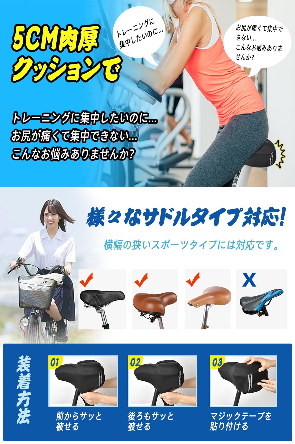 【取り付けが簡単・工具不要】たった3ステップで快適なサドルにします。ステップ 1 :サドルにカバーを被せます。ステップ 2 :サドルカバーを自転車に固定します。ステップ 3 :マジックテープを貼り付けます。テープクロス式で、交差十字式の固定方法は初心者にも易しいです。裏面は前後袋状になっており、前後からサドルにかぶせて上下よりほうが安定です。