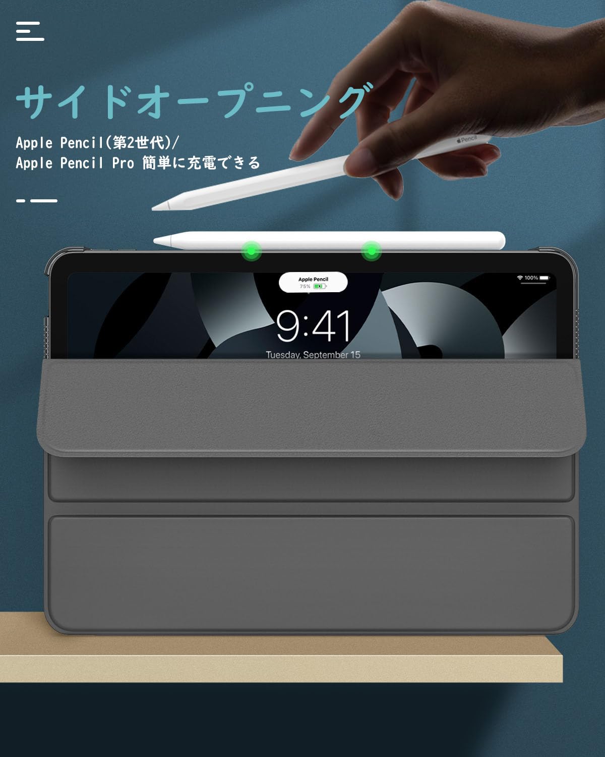 「ぴったり着装」 専用設計された全面保護ケースとなっているため、ケースを装着したまま電源ボタン、音量ボタン、写真を撮る、充電等すべての機能にアクセスできます。ApplePencil USB-C(iPad Air 11インチ用)の磁気吸着、Pencil Pro(iPad Air 11インチ用)及び ApplePencil第2世代(iPad Air 第5世代/第4世代 10.9インチ用)のワイヤレス充電に対応できます。