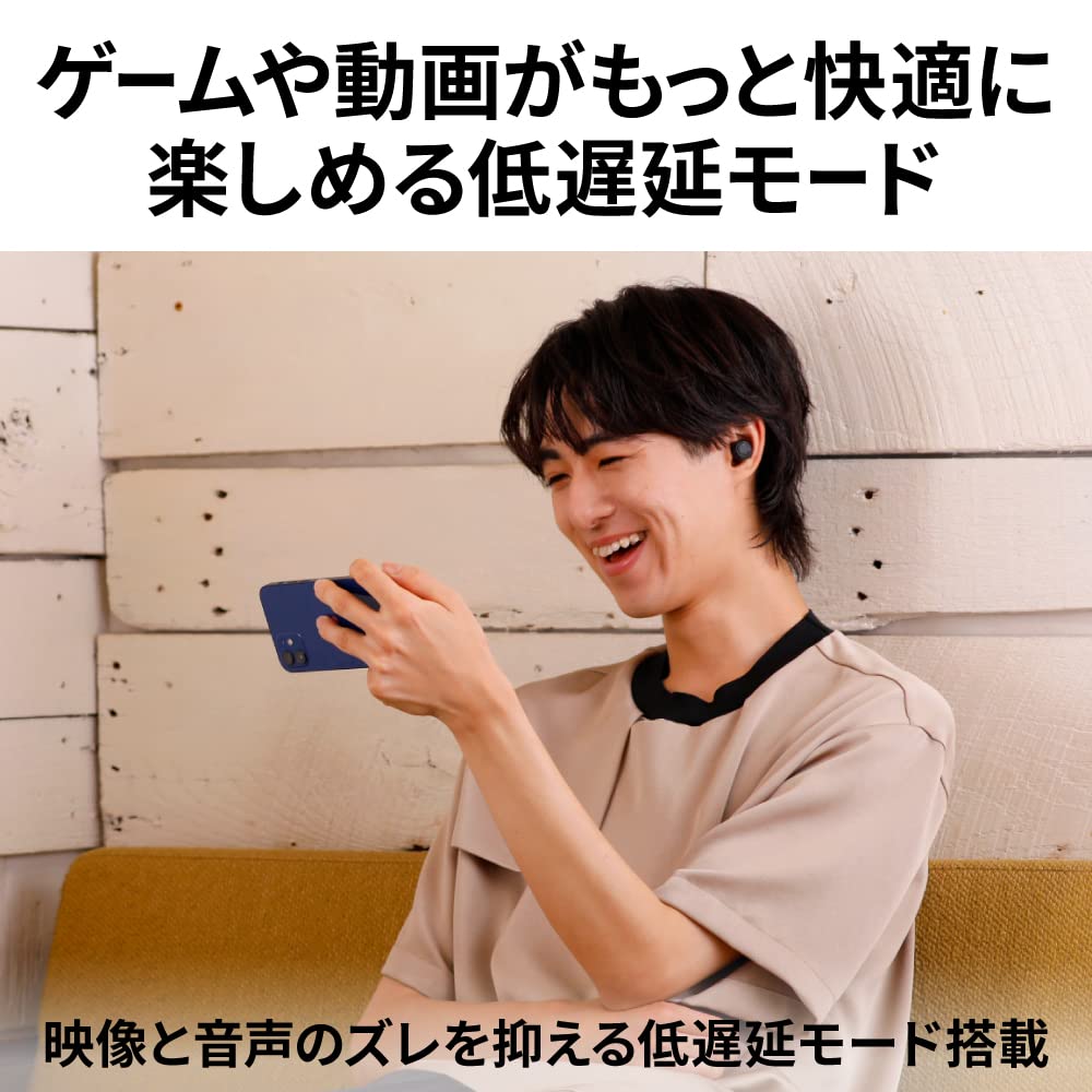 【ゲームや動画視聴をより快適に楽しめる低遅延モード】Bluetooth伝送時に必ず発生する音声の遅延を抑制し、映像とのずれを抑え、スマートフォンやタブレットでのゲームや動画視聴を快適に楽しめる低遅延モードを搭載。低遅延モードはイヤホン本体でON/OFFの操作が可能。