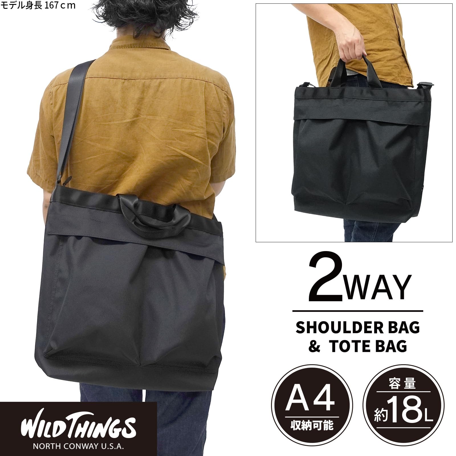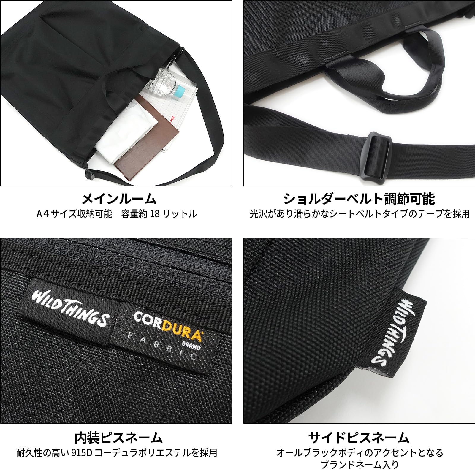【新着商品】[ワイルドシングス] ショルダーバッグ WT-380-3406 ショルダー コーデュラ 無地 黒 手提げ 大容量 カラビナ付 ポケット多数 メンズ