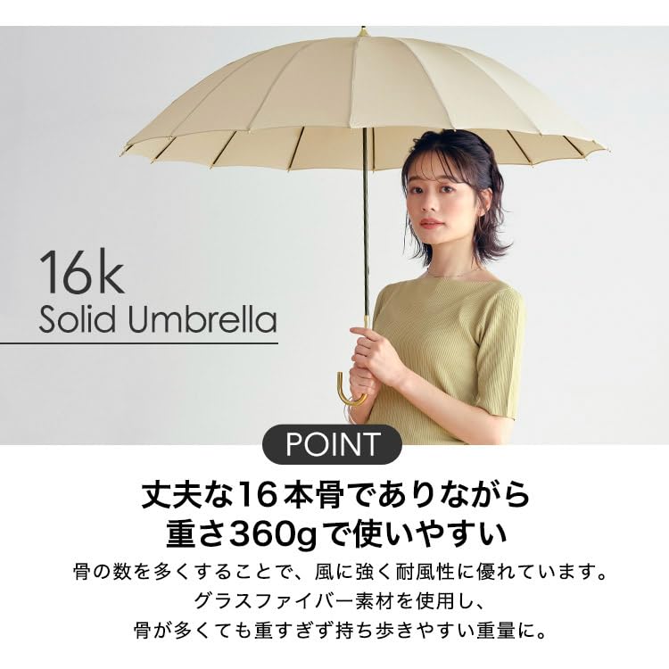 ゴールド手元を使用した、上品でシンプルな16本骨アンブレラ。 ゴールド手元を使用することで繊細かつ大人っぽい印象を演出する、丈夫な16本骨アンブレラ。 骨の数が多いため風に強く耐風性に優れていながら、グラスファイバー骨を使用することで持ち歩きやすい重さにこだわりました。