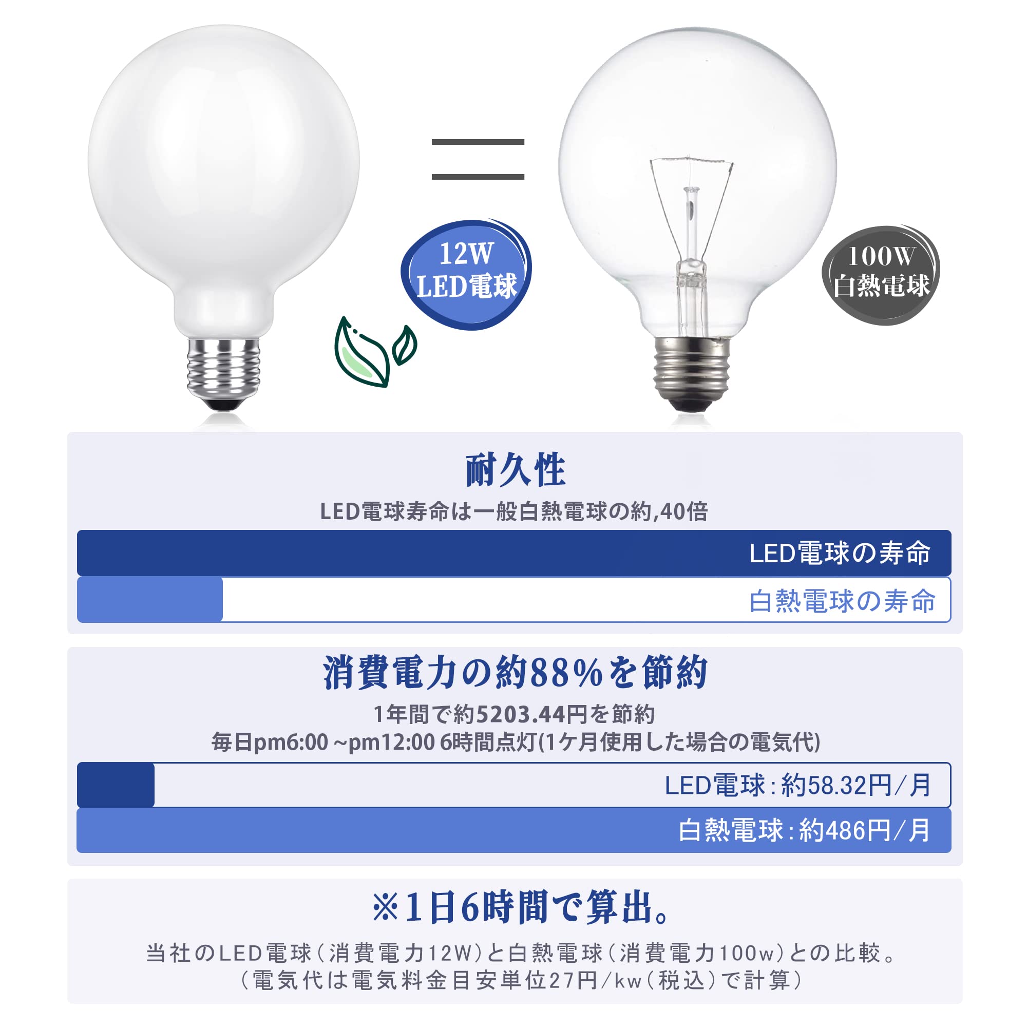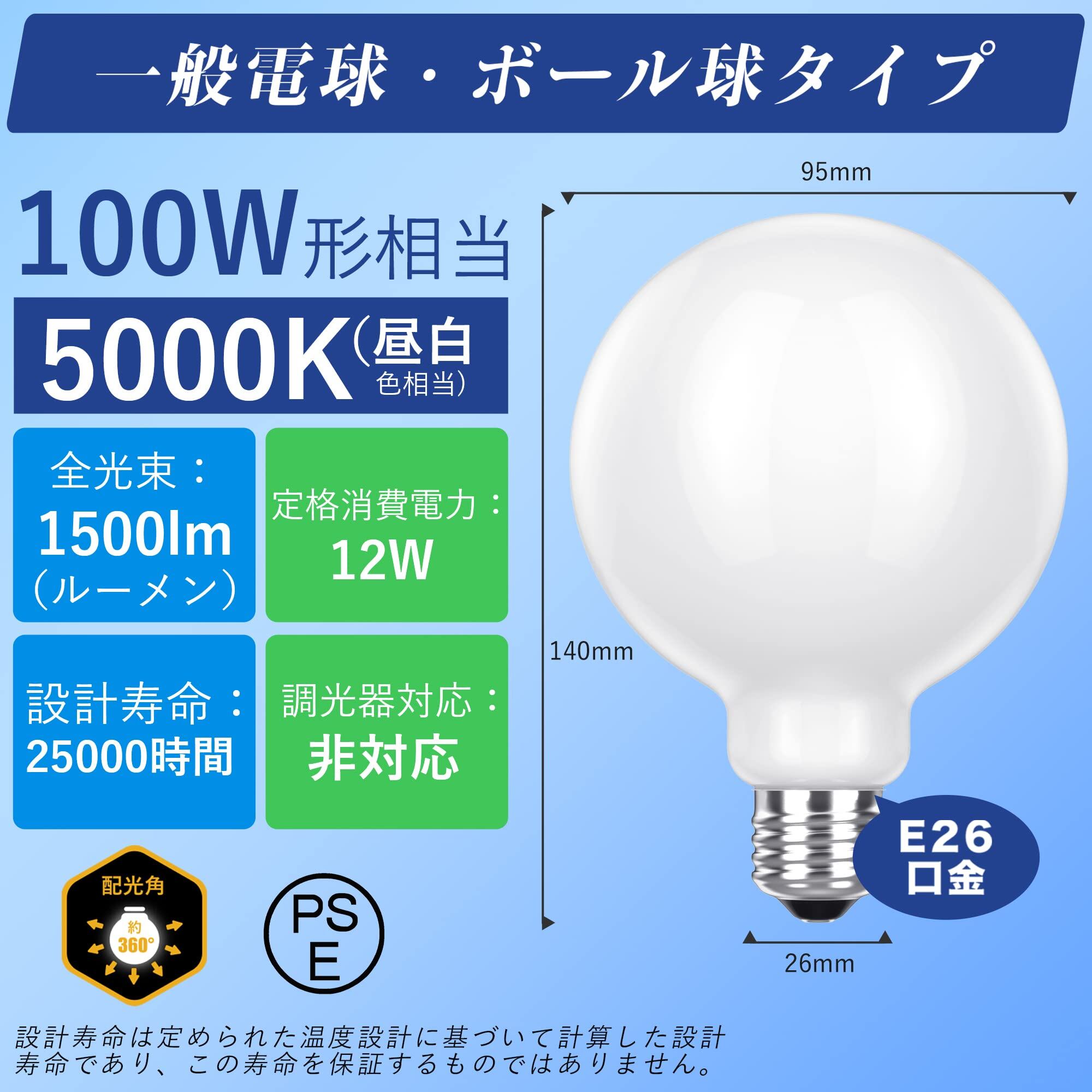 〖製品仕様〗:G95 対応口金:E26、定格消費電力:12W(100W形相当)、定格電圧:100V 50/60Hz共用 、消費効率:125lm/W、全光束:1500lm、色温度:5000K 昼白色相当、サイズ:Φ95*140mm、調光:調光器非対応