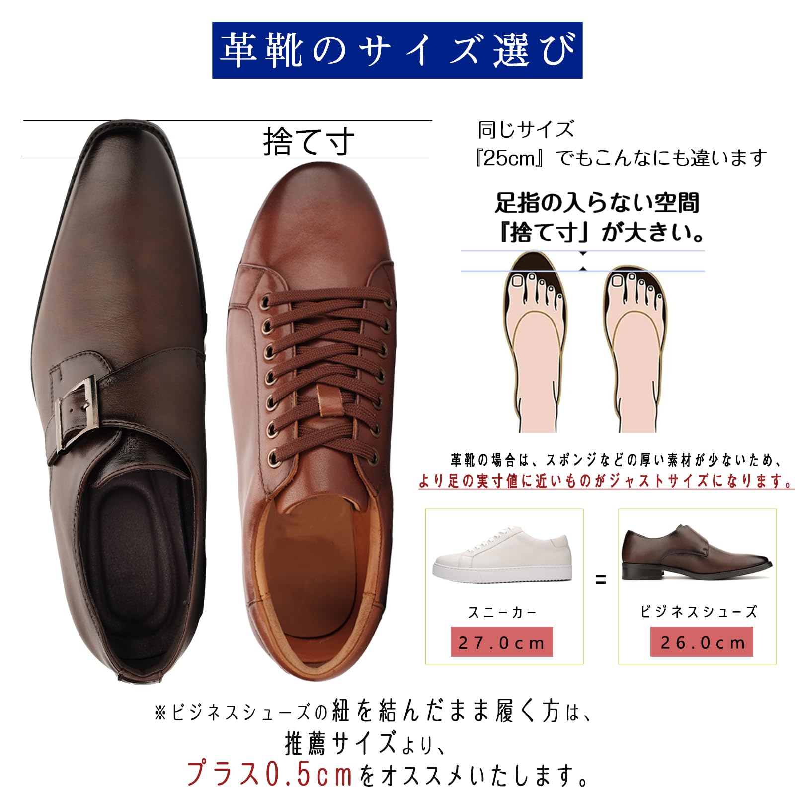 革靴の場合は、スポンジなどの厚い素材が少ない為、より足の実寸値に近いものがジャストサイズになります。※スポーツブランドで27.0cmを履かれている方は、SIZE:42(26.0cm)程度とお考え下さい。