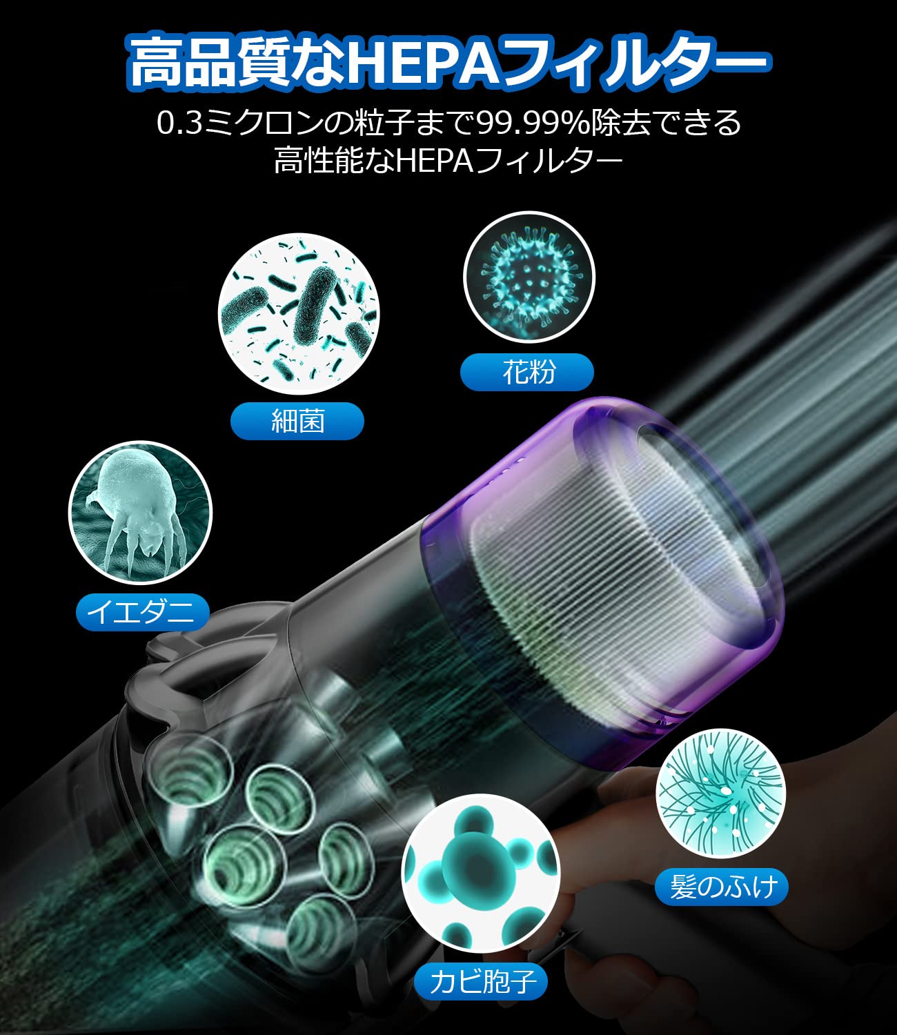 【高品質なHEPAフィルター】高品質な真空HEPAフィルターを採用しており、0.3ミクロンの微細な粒子を99.99%捕らえられますから、細かい粒子、ほこり、花粉などを効率的に阻止します。清潔な空間を維持してくれます。
