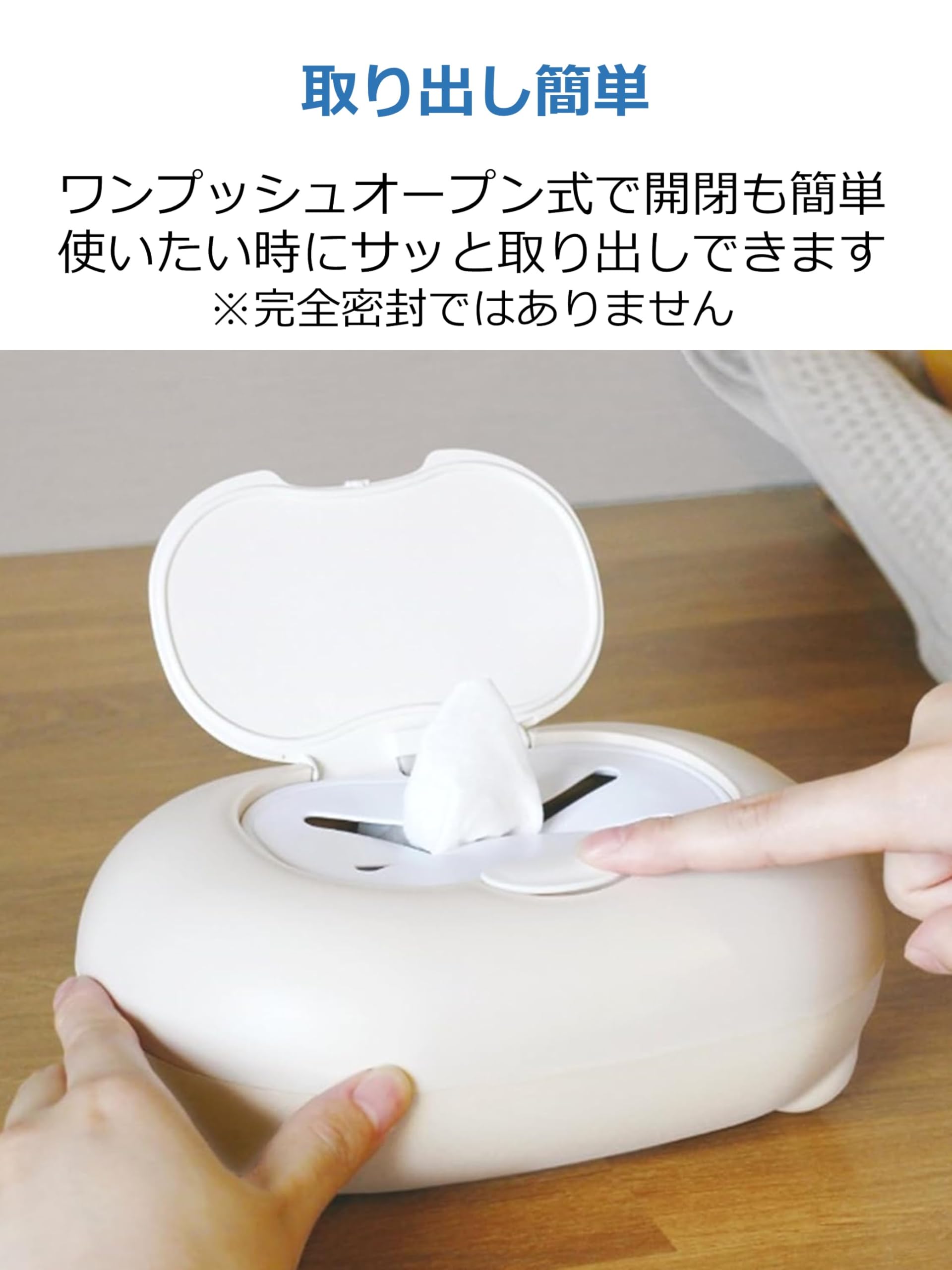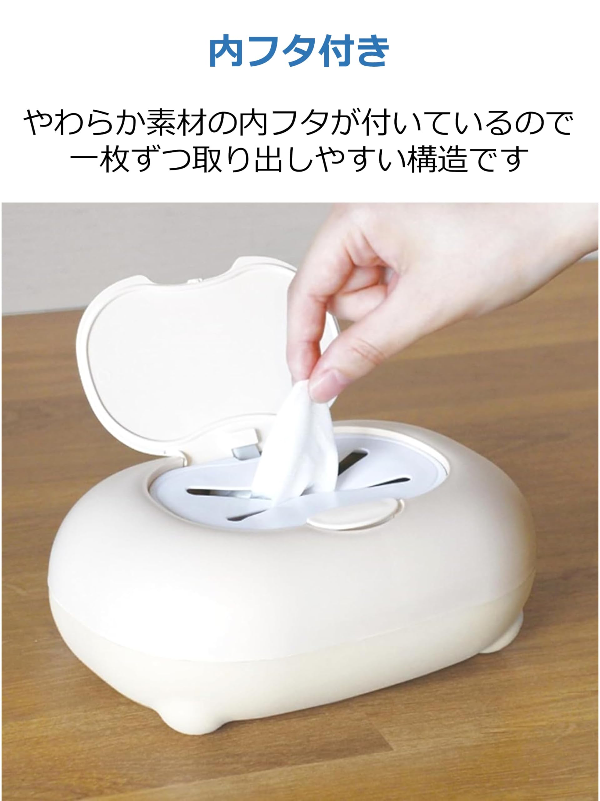 ・ティッシュが一枚ずつ取り出せる、やわらか素材の中フタ付き。