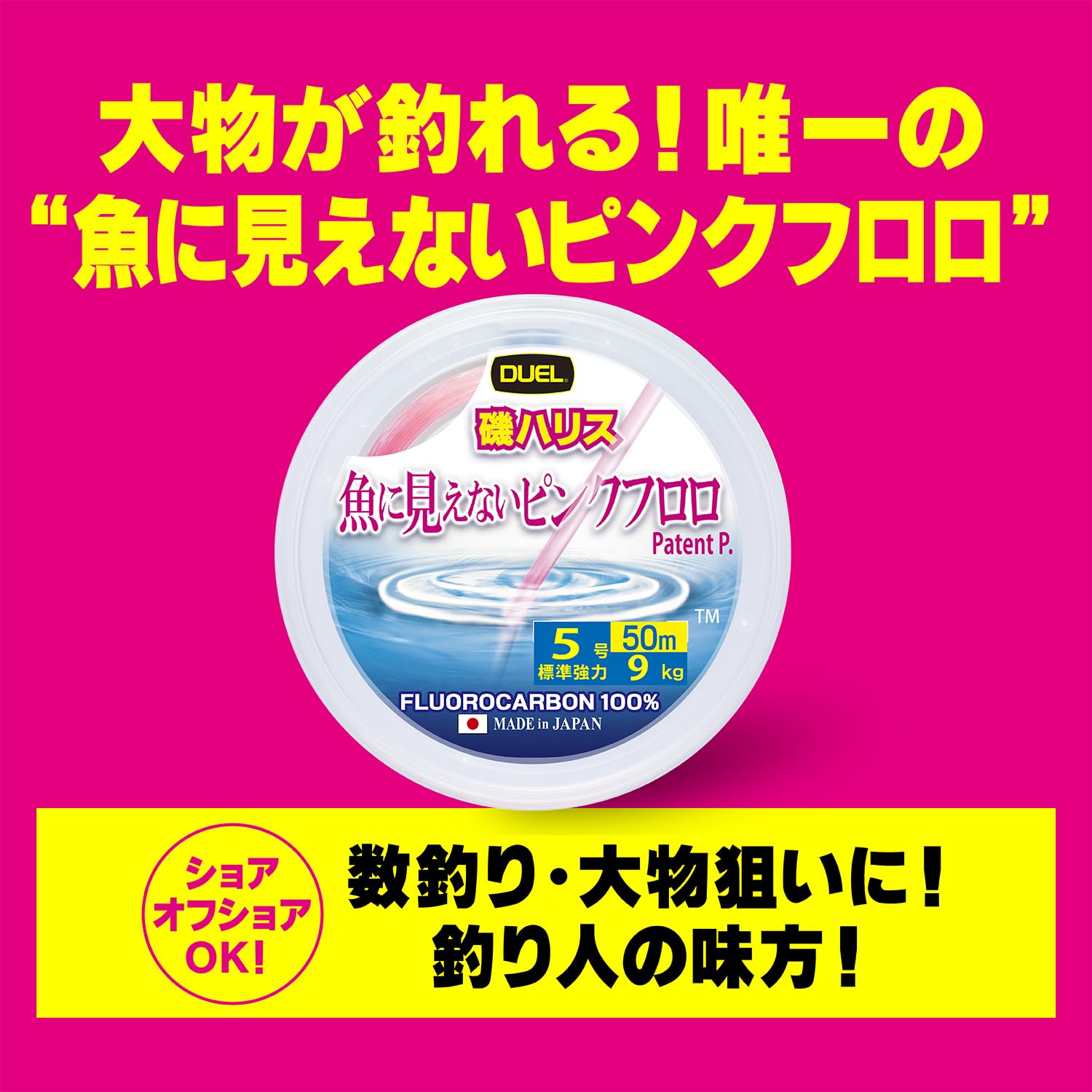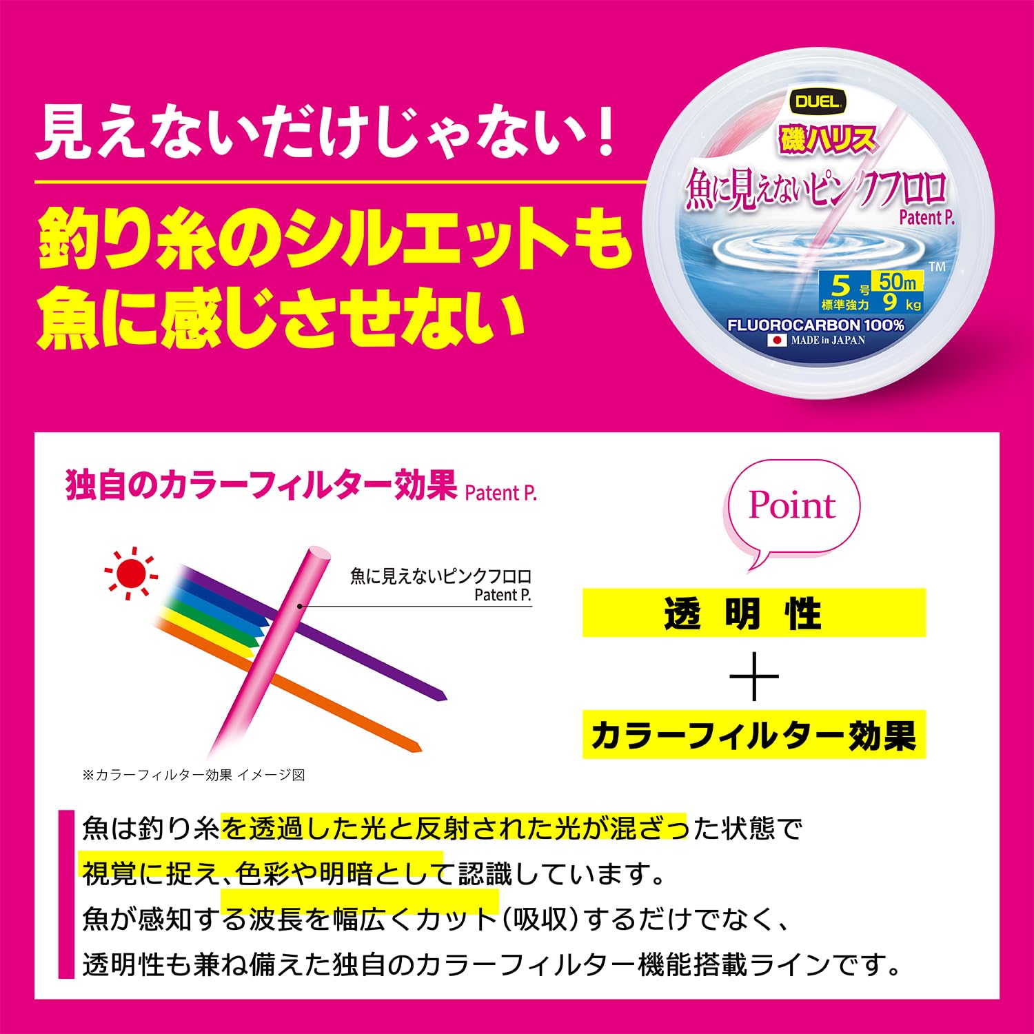◆人に見やすく魚に見えにくい「ステルスピンク」採用、一般的なピンクラインよりも幅広く”魚に見えない色相領域”をカバー