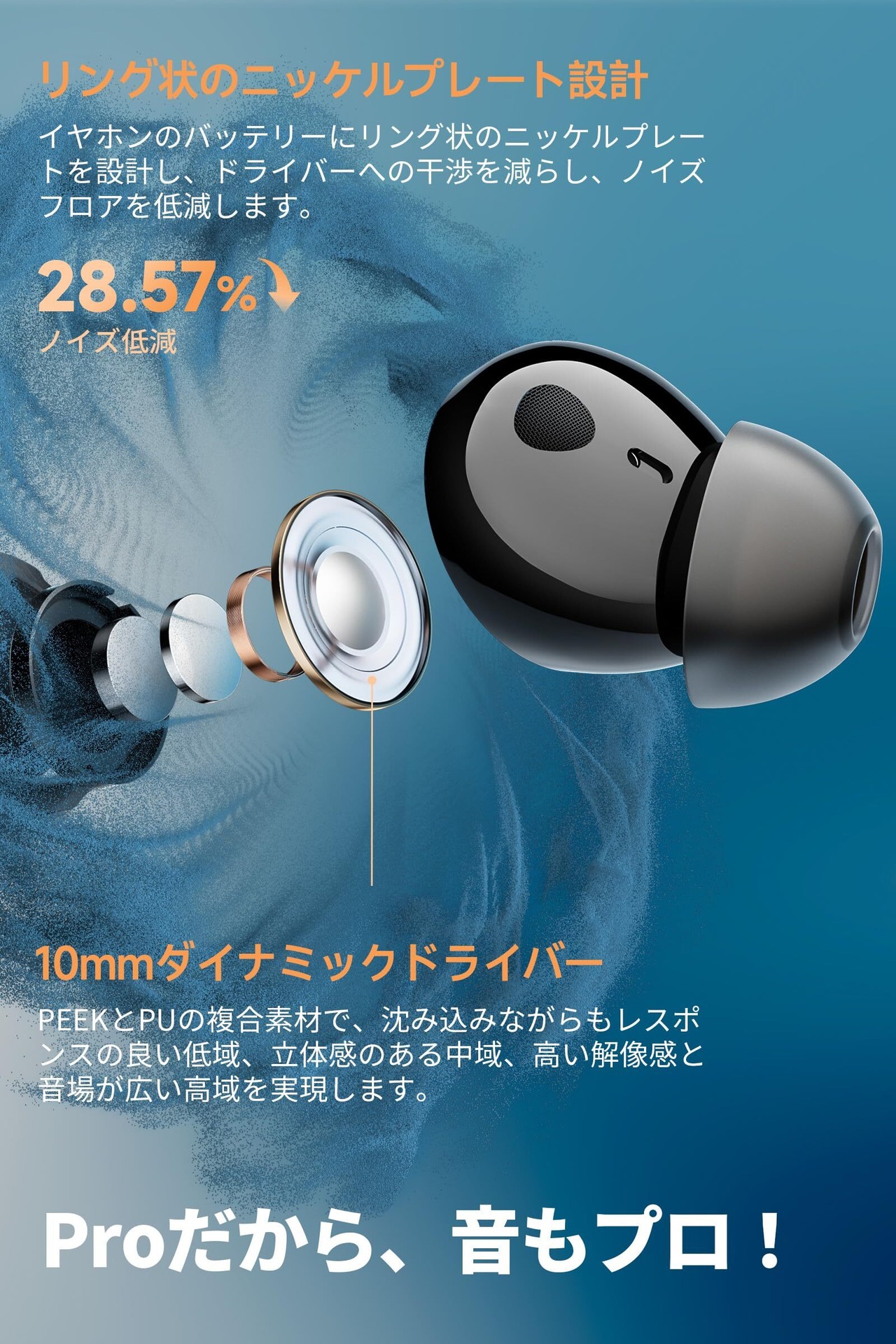【SOUNDPEATSならではの高音質~ポケットに収まる高音質ガジェット】ワイヤレスイヤホン Air5 Proは、10mm径ダイナミックドライバーを搭載。振動板には、耐熱性・強度に優れ、内部損失性にも長けたポリエーテルエーテルケトン(PEEK)とポリウレタン(PU)の複合素材を採用しました。さらに、SOUNDPEATSのノウハウを活かしたアコースティック設計と調整を施すことで、低音から高音までバランスの取れた歪みの少ないクリアな音を実現しました。また、高性能なダイナミックドライバーと高音質コーデック「LDAC」※/「aptX Lossless」を組み合わせることで、クリアで透明感あふれるサウンドを実現。コストパフォーマンスを意識しつつもクオリティには妥協しない、SOUNDPEATSならではの「パワフル&ダイナミックサウンド」をぜひ体感してください。※「PeatsAudio」アプリでマルチポイント機能をオフにすると、LDACコーデックをご利用いただけます。