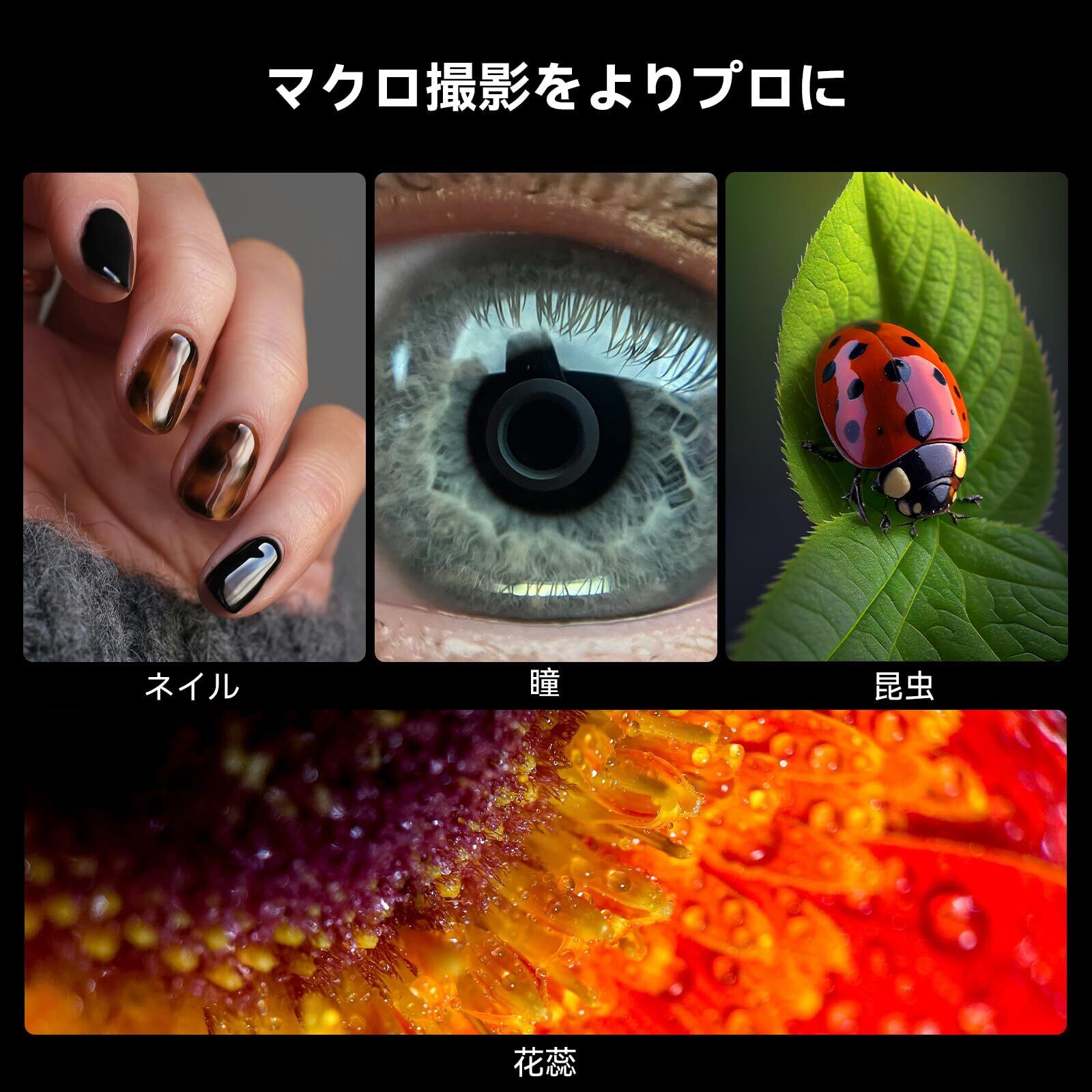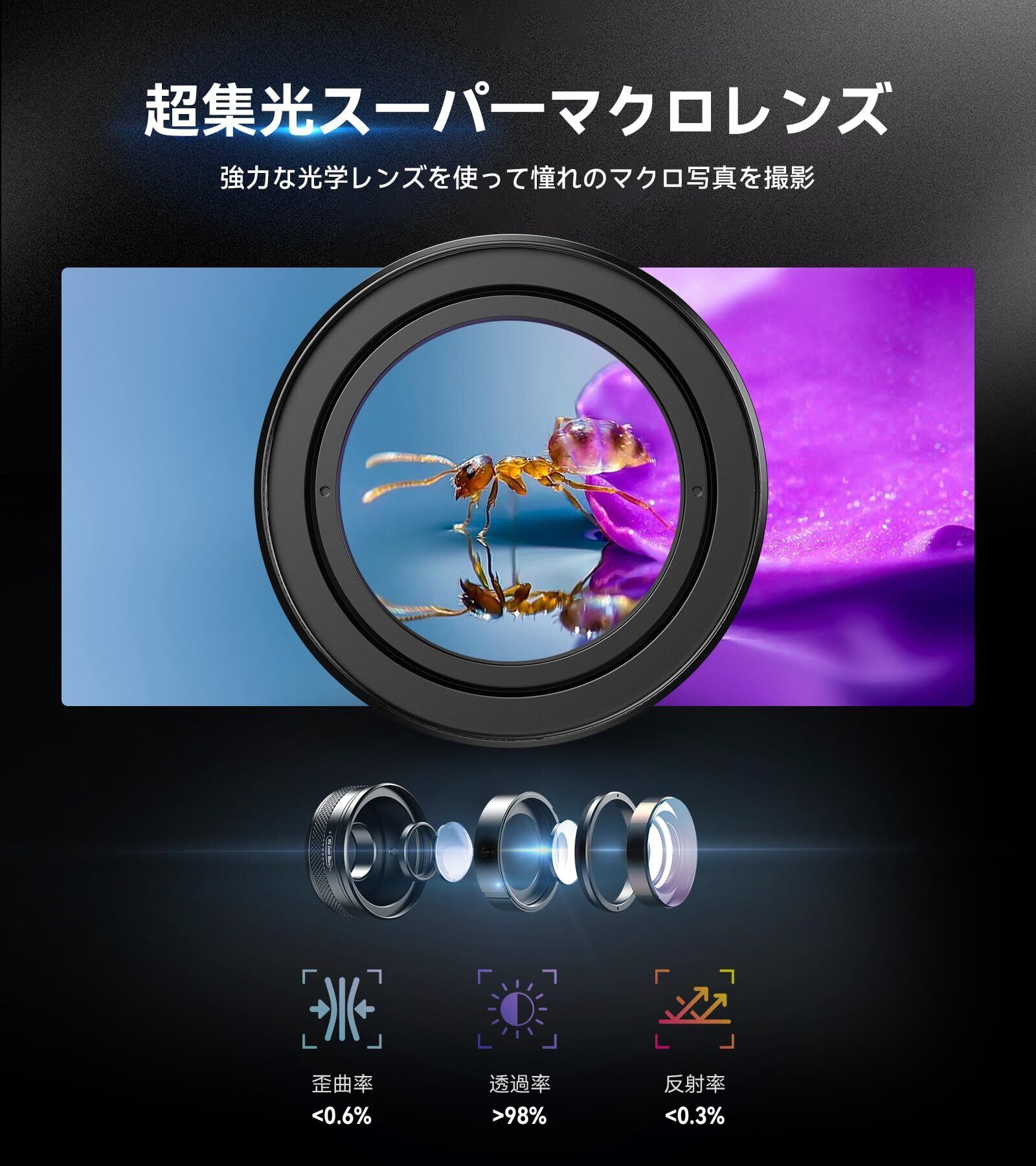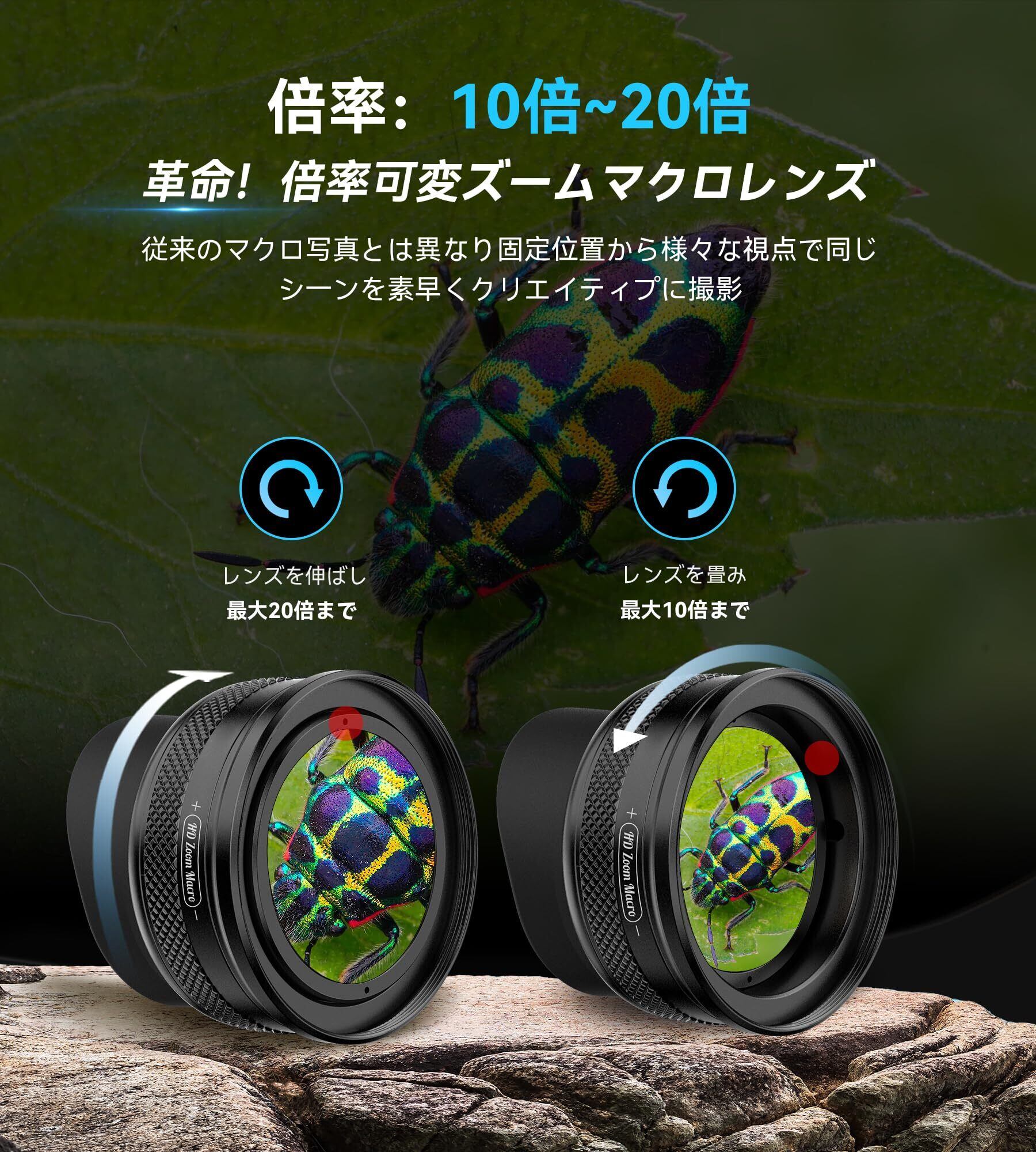 【業界初!ズームマクロレンズ】10~20倍と倍率可変スマホズームマクロレンズです。最大10 倍、さらには20 倍のズ一ムで細部まで鮮明な写真を撮影できます。究極的に焦点距離は1.5~4.5cm伸縮可能です。従来の外付けレンズの難点(ピント合わせ難しい)を完璧に解決しました。ズ一ムリングを素早く切リ替えて動く被写体も美しく捉えます。