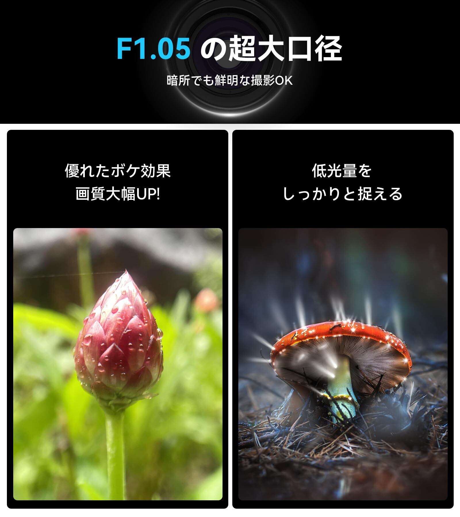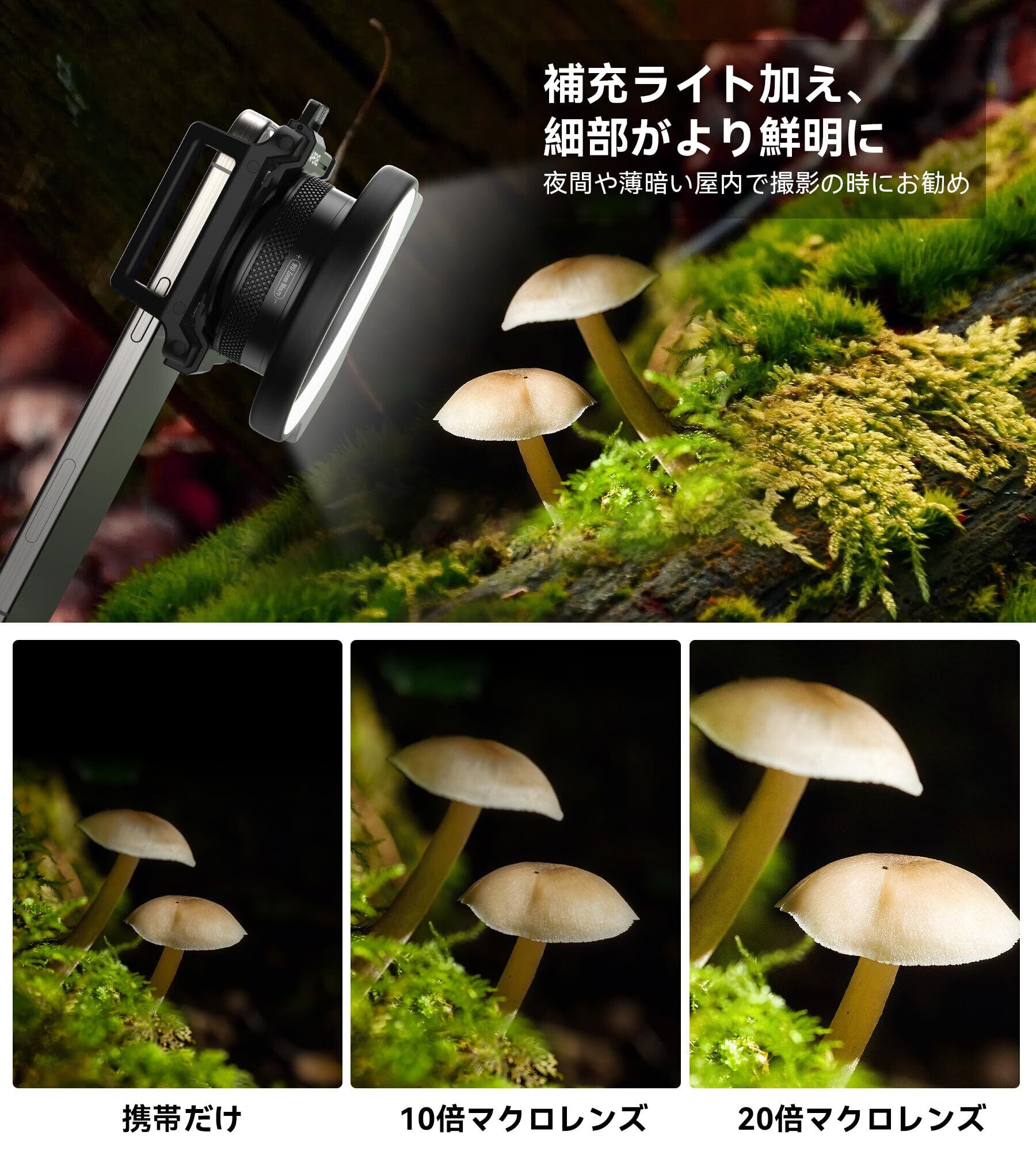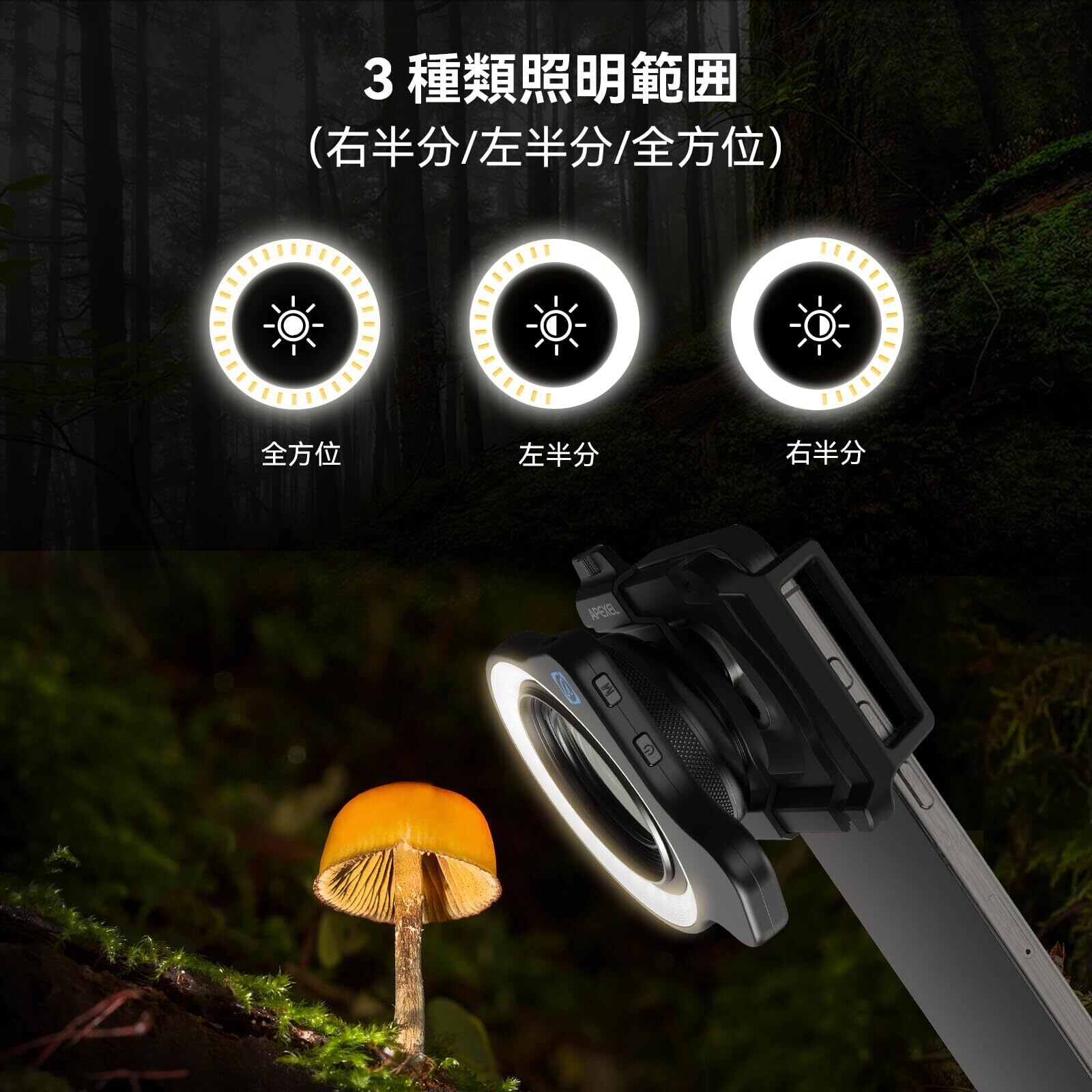 【暗所でも鮮明な撮影OK】撮影補充LEDライトも付き、360°全方位輝度補充できます。夜間でもクリアで綺麗に撮れます。クロ撮影は被写体に2㎝ぐらい近づかいと撮影できません。被写体に非常に近いので照明不足になり被写体本来の色再現できません。APEXEL FL26はこの問題を解決すよるように設計されました。マクロ撮影をもっと完璧に!