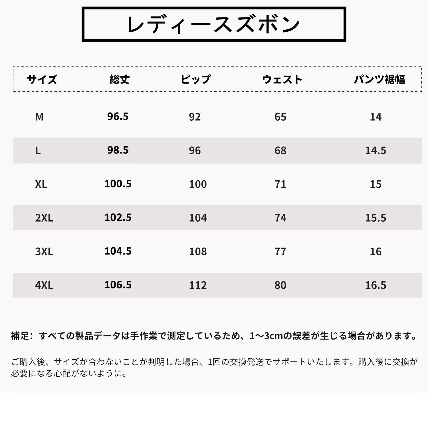 【ズボンレディース】ご注文の際は、普段のサイズよりワンサイズ大きめをご購入ください。6サイズ:M、L、XL、2XL、3XL、4XL からお選びいただけます。商品はサイズが小さめです。