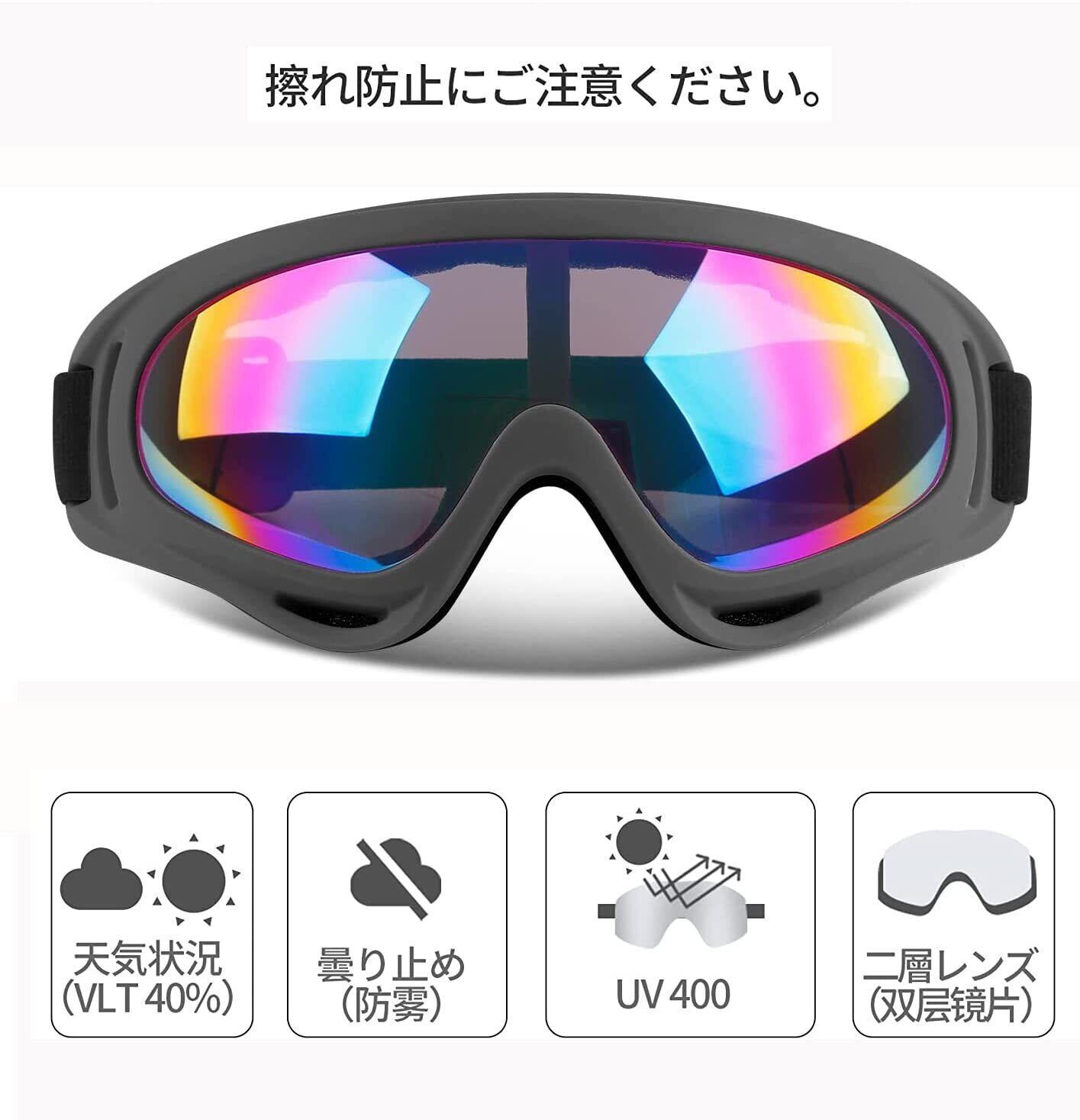 【UV400による安心保護】UV400保護処理を施したレンズは単に雪山の眩しさを和らげるだけでなく、紫外線から目を守る役割があります。曇りの多い天気・晴天に適切です。本製品を使用して、鮮明な視覚体験でウインタースポーツを楽しみながら、雪目を発症する心配も要りません。