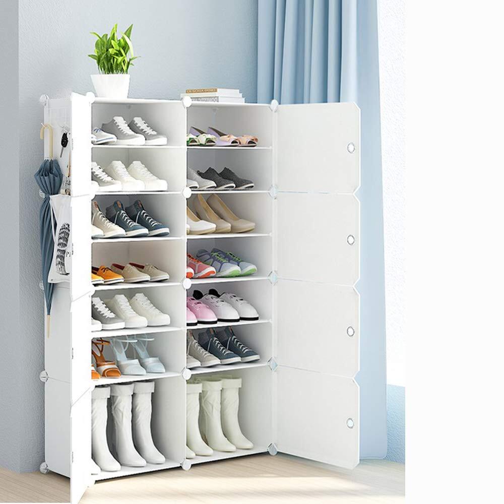 【省スペース&大容量】サイズ: 85cm(幅)× 32cm(奥行)×127cm(高さ)材質:本体/樹脂、柱/厚鉄パイプ。28 ~ 42足まで対応できます。ルービックキューブはそれぞれ二重構造になっていて、間の仕切りが取り外し可能になっているため、ブーツやハイヒールなどを収納できるスペースがあり、バッグやシューズボックスなどを収納できます。