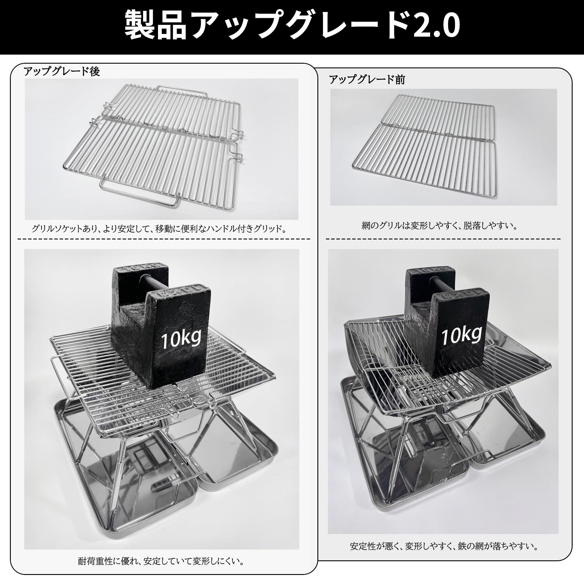 【機能向上】1.バーベキュー網を厚くして、使用中のバーベキュー網の崩れを防ぎ、耐荷重を増やす、2.バーベキュー網にスナップを付けて、使用中のバーベキュー網の滑りを防ぐ、3.バーベキュー網に一組の取っ手を付けて、使用中の移動を容易にする