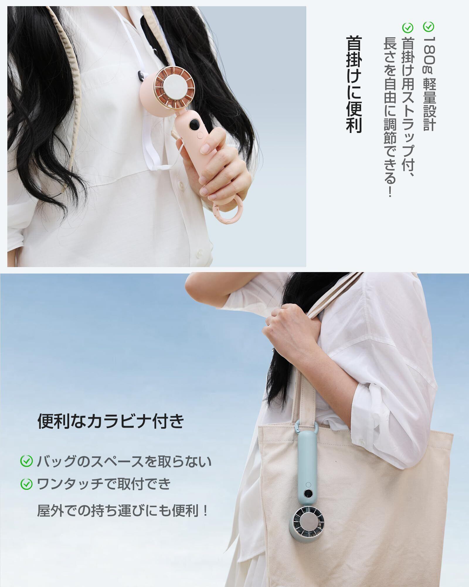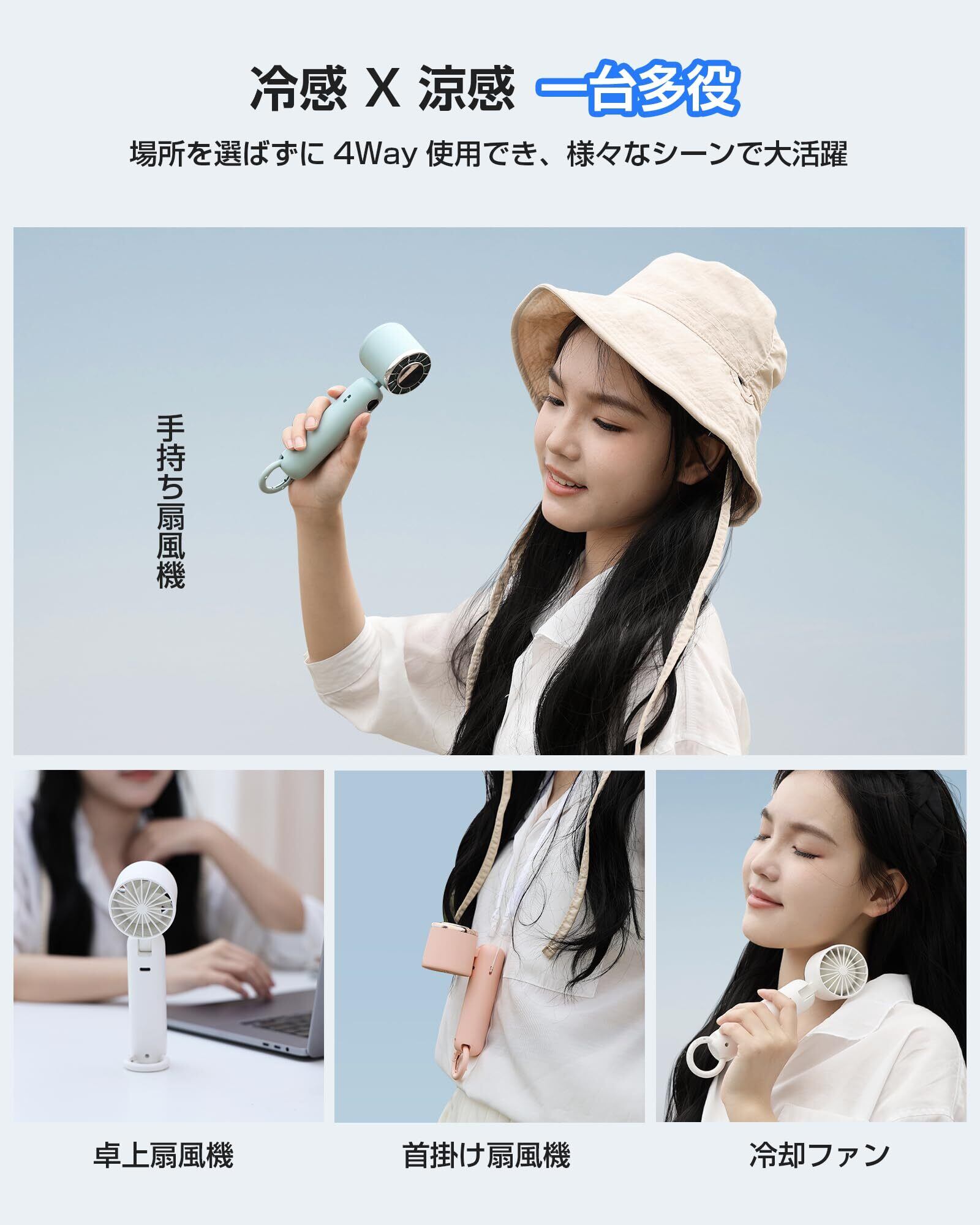 【1台多役&携帯便利】4Wayの使い方ができるハンディタイプの携帯扇風機です。①手にフィットするスリムなボディー設計で、握りやすく、手持ち扇風機として長時間使用しても疲れを感じません。②長さを自由に調節できるネックストラップが付いており、ハンズフリーで首にかけて使用でき、作業中や移動中にも便利です。③スタンドとしても使用可能なカラビナが付属しており、卓上での使用もできるため、卓上扇風機としてオフィスや自宅でも便利にお使いいただけます。④冷却プレートを肌に押しあてることで瞬時に肌を冷やすことができるため、ネッククーラーややけどの応急冷却グッズとしても活躍します。軽量かつコンパクトなサイズなので、いつでもどこでも手軽に持ち運ぶことができます。