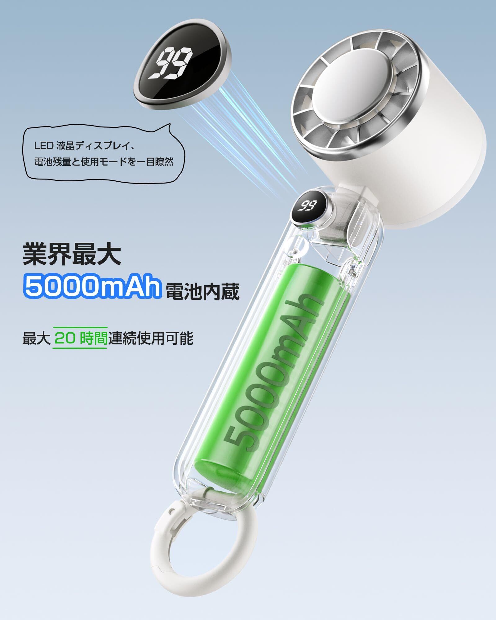 【携帯扇風機史上最長使用時間&5000mAh電池容量】一般的な手持ち扇風機は2000~3000mAhの電池を搭載し、最長で10時間しか連続使用できません。一方、HAGOOGIの新型携帯扇風機は5000mAhの大容量電池を搭載し、弱風モードで最長20時間、中風モードで6~9時間、強風モードで3~6時間の連続使用が可能です。通勤や通学などの移動中だけでなく、一日中デスクワークや野外イベント中も余裕を持って使用できます。LEDディスプレイが搭載されており、バッテリー残量や風量段階が一目でわかり、従来のランプ式よりも細かく電池残量を把握でき、扇風機の充電タイミングもわかりやすくなります。