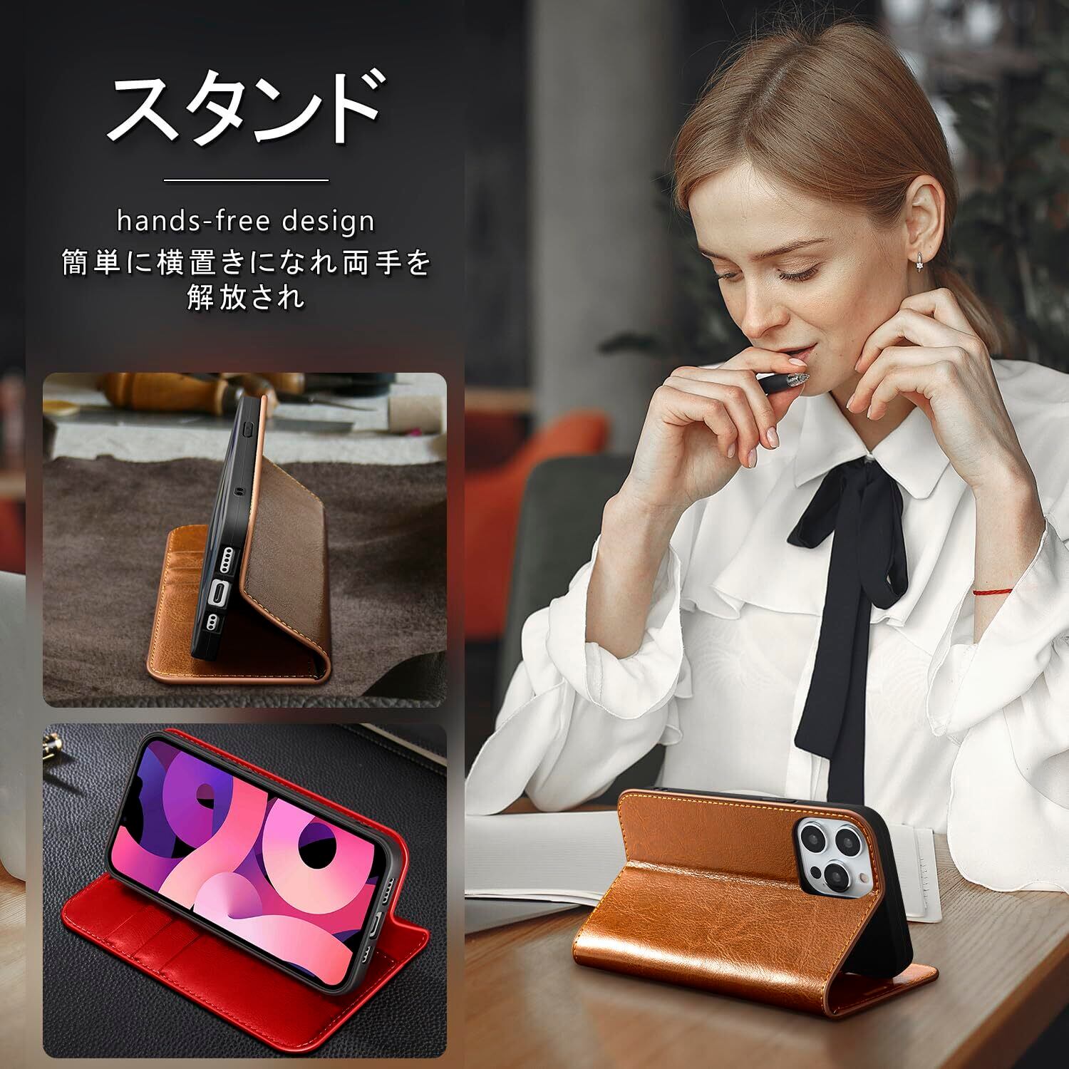 【自由の機能さ】:ケースを装着ままで携帯のボタンを全てスムーズに使用し、スタンド機能も搭載し、横置きしてお好きな角度で調整できます。