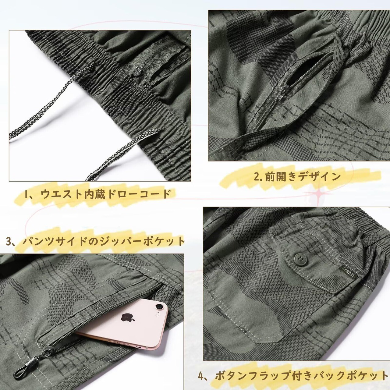 【5つポケット付き】前×2、サイド×2、後ろ×1のポケットで、スマホや小物をしっかり収納。アウトドアや作業時に便利な実用的な設計。