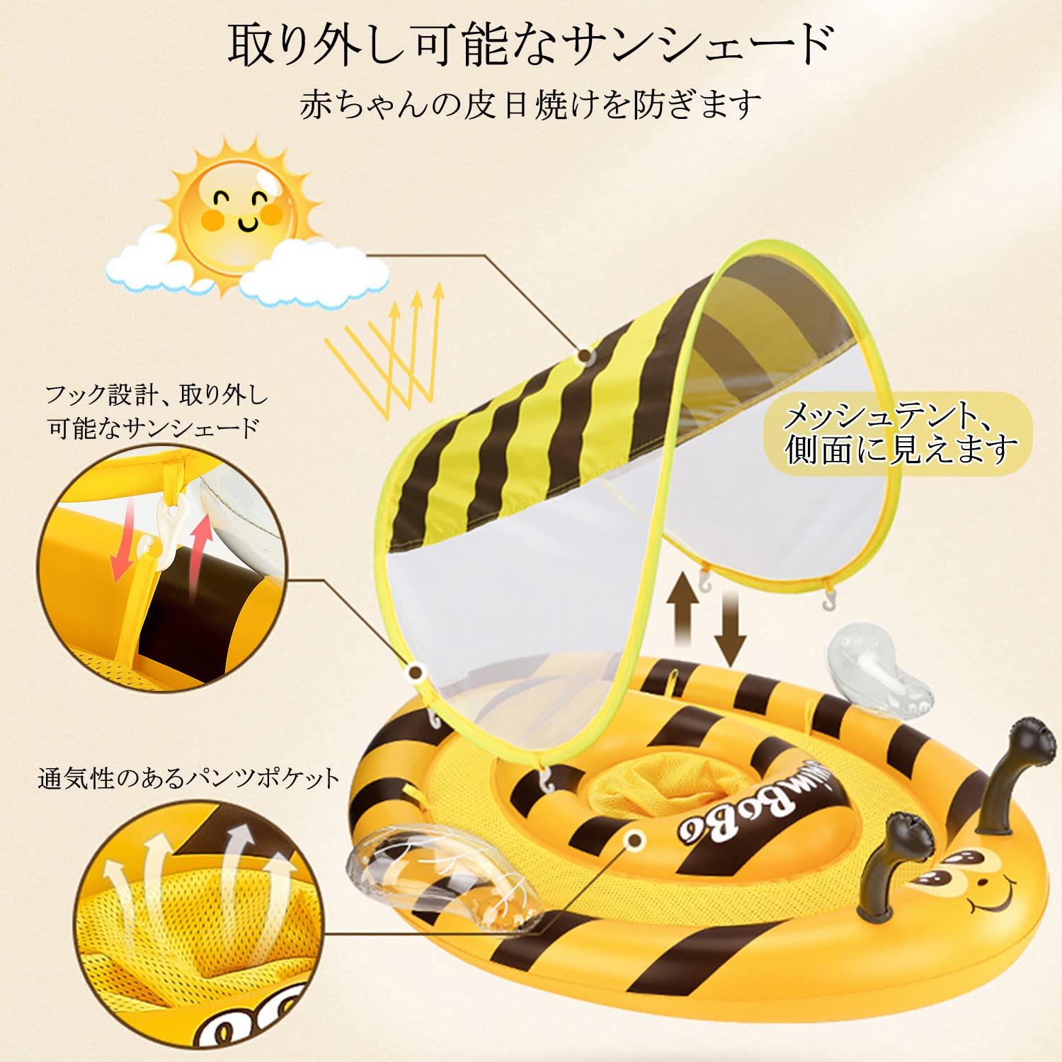 【ユニークで魅力的なデザインとUPF 50+取り外し可能なサンシェード】蜂ベビー浮き輪、取り外し可能/調整可能なキャノピーが装備されており。 赤ちゃんの成長をよりよくケアするために、UPF 50+日焼け止めを達成できます。足入れ浮き輪は子供たちが泳いだり、プールで遊ぶことができます。
