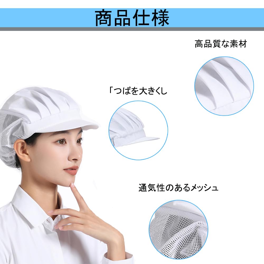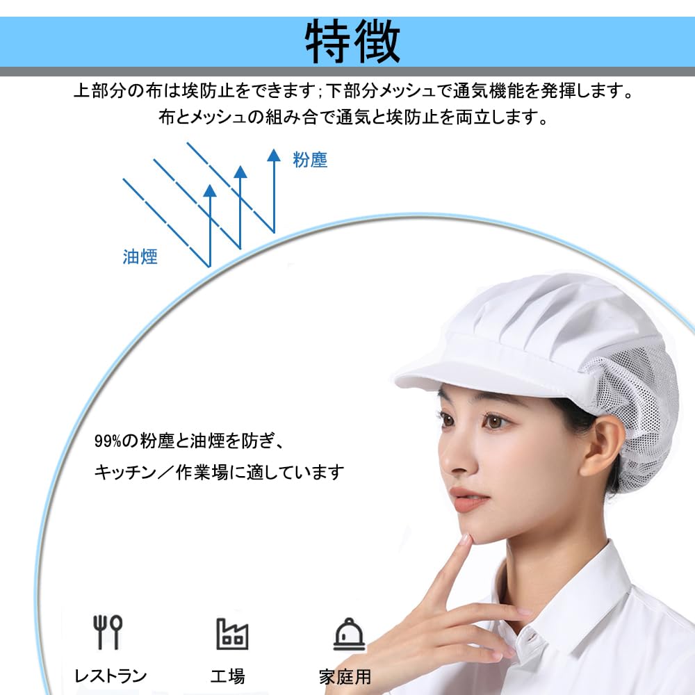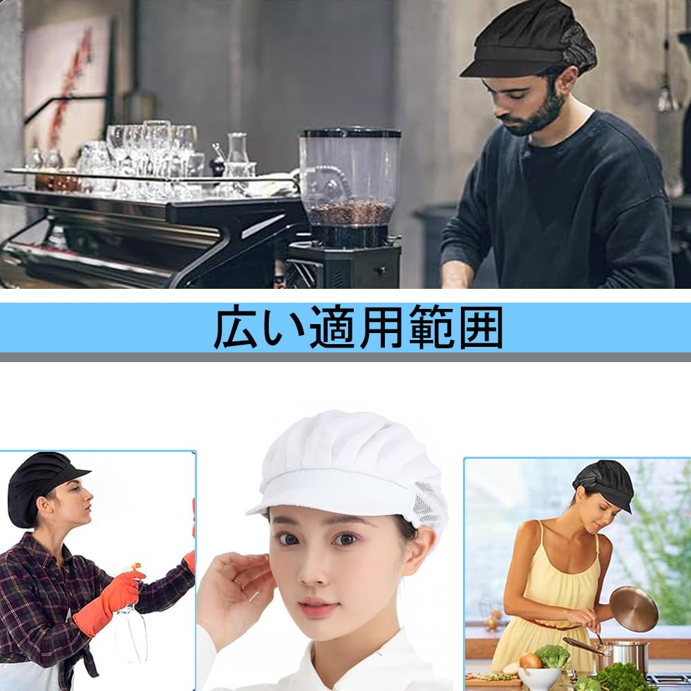 全面的な保護:頭髪を完全に覆い、髪の抜け落ちやほこりの汚染を効果的に防ぎます。食品と作業環境の清潔を維持します。