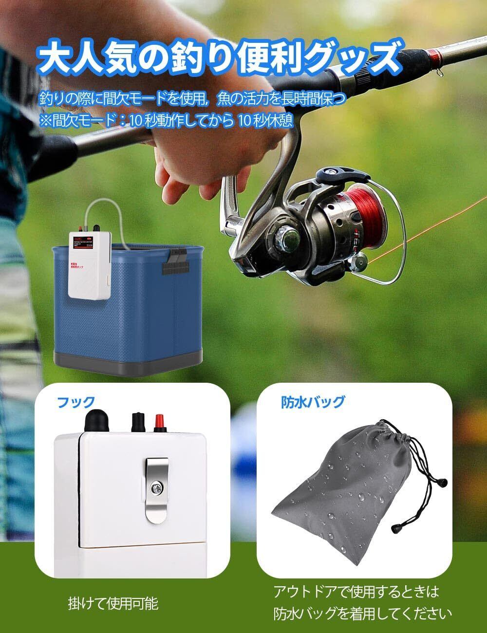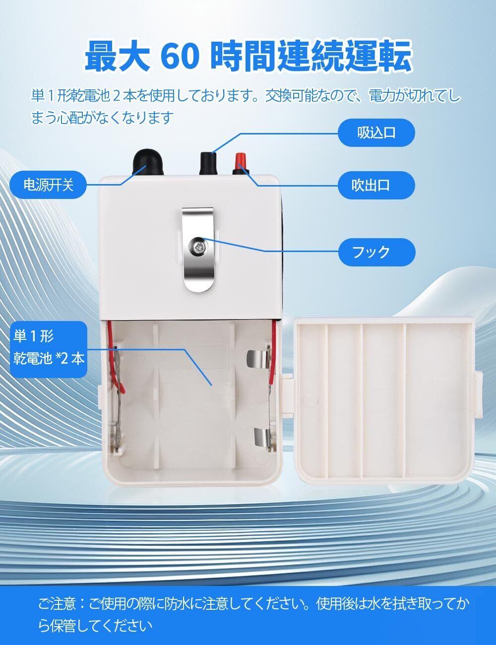【アウトドでお釣り】エアポンプには付属品が揃っています。乾電池だけをご購入になれば、ご利用いただけます。サイズ小さくて、防水収納袋も付属されていて持ち運び便利です。エアポンプに金属フックが付属されています。バケツやタックルボックスに掛けることができ、屋外でお釣り用に適します。