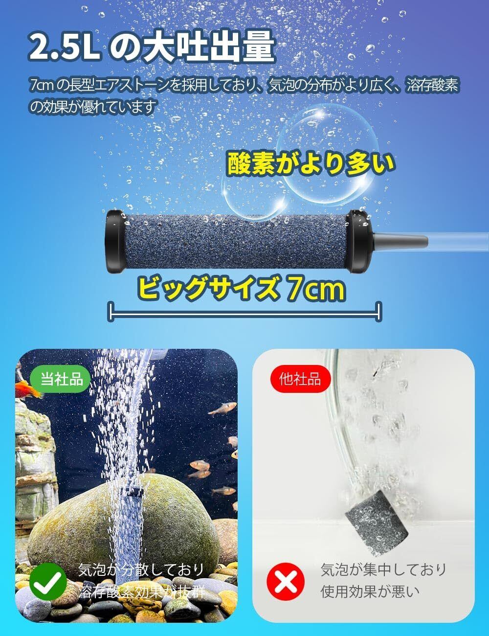 【大きい吐出量/乾電池で駆動】エアーポンプの最大吐出量は2L/minで、水深60cmにおすすめします。本体重量:約155g。単1型乾電池2本で駆動(乾電池1本でも動作可能)、電池交換するにはネジを外す必要なくてとても便利です。付属品にはチューブ、ストーン、逆流防止弁、防水収納袋が入っています。