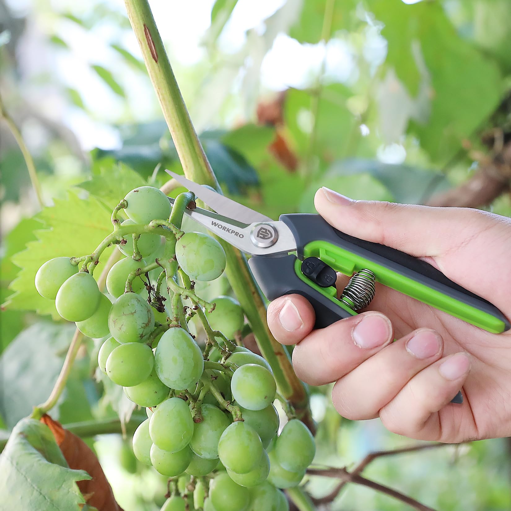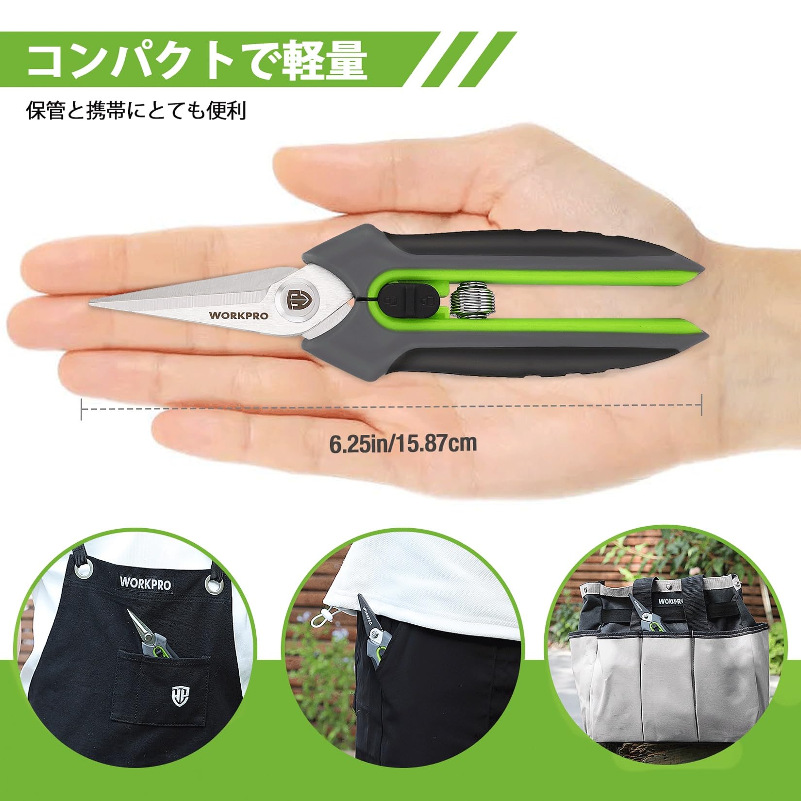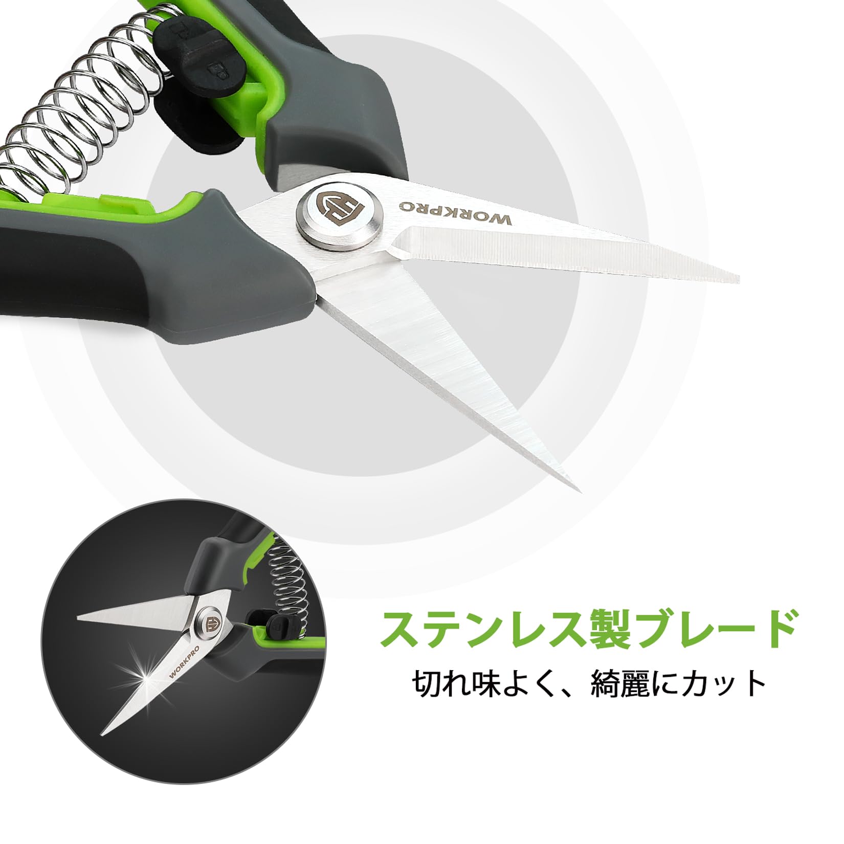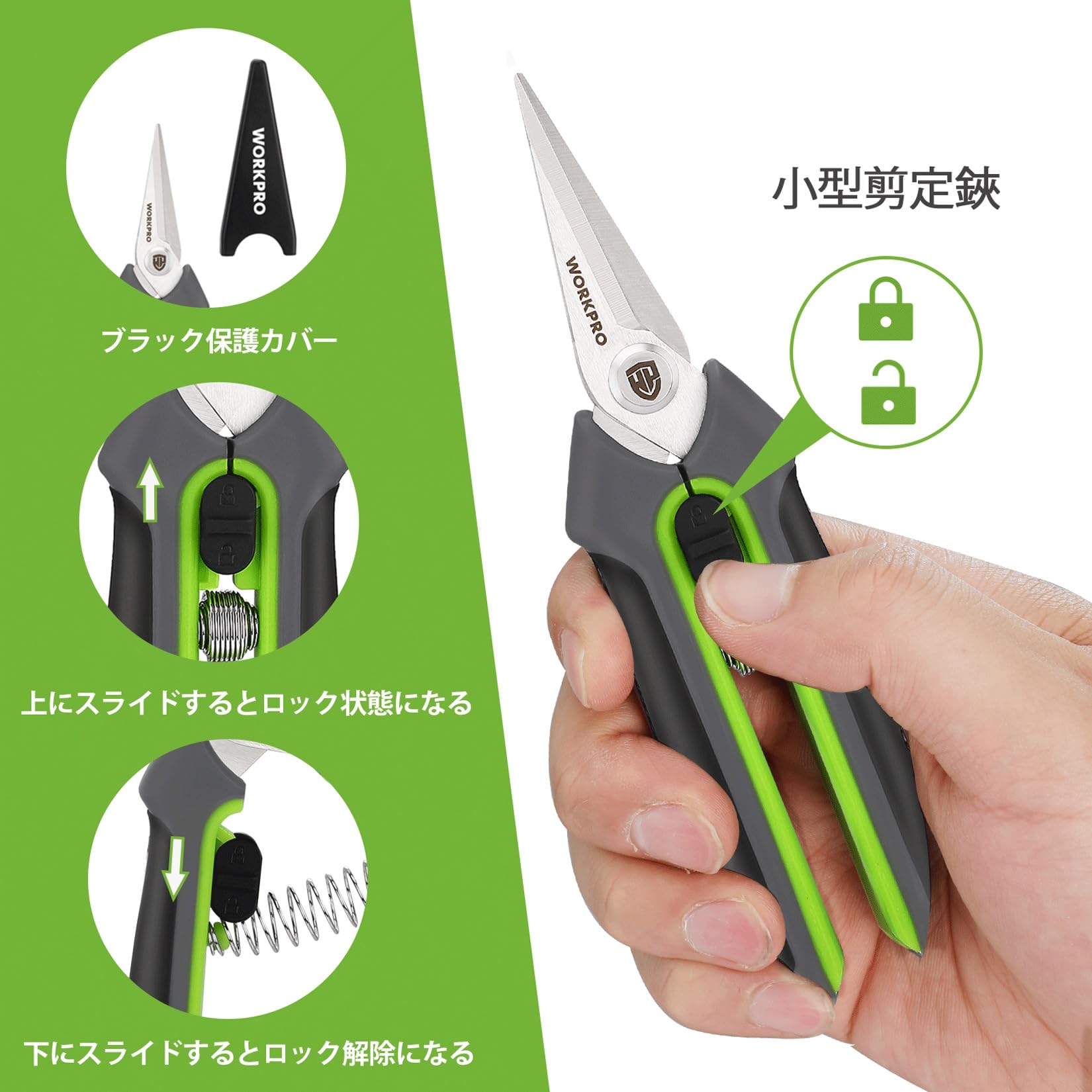 WORKPRO 剪定ばさみ 園芸ばさみ 鋏 剪定鋏 園芸鋏 ハサミ サクサク切れる 握りやすい 安全ロック付き 生け花 庭木 枝切り 果樹 盆栽 庭園 剪定 作業 はさみ グリーン&ブラック