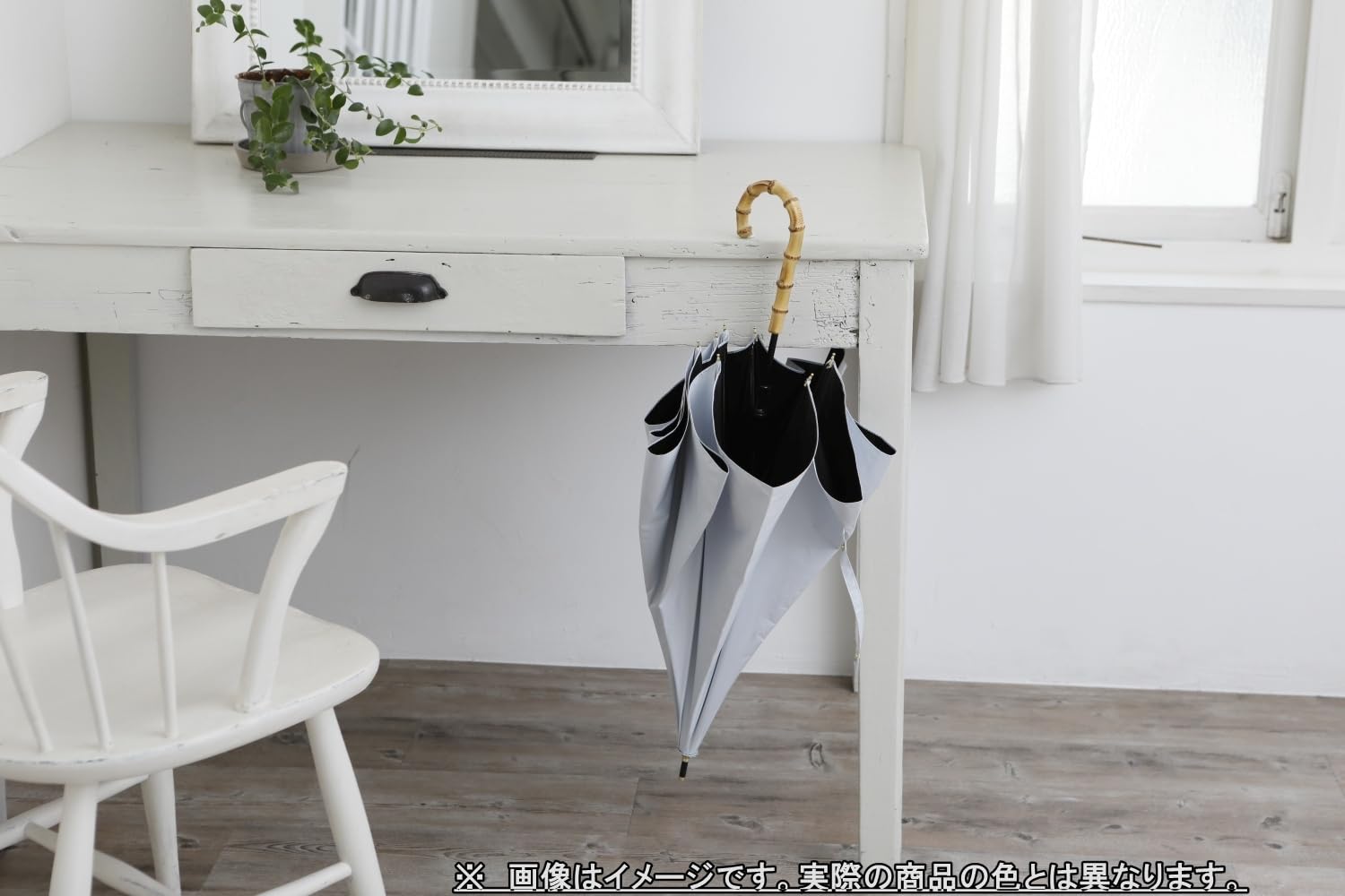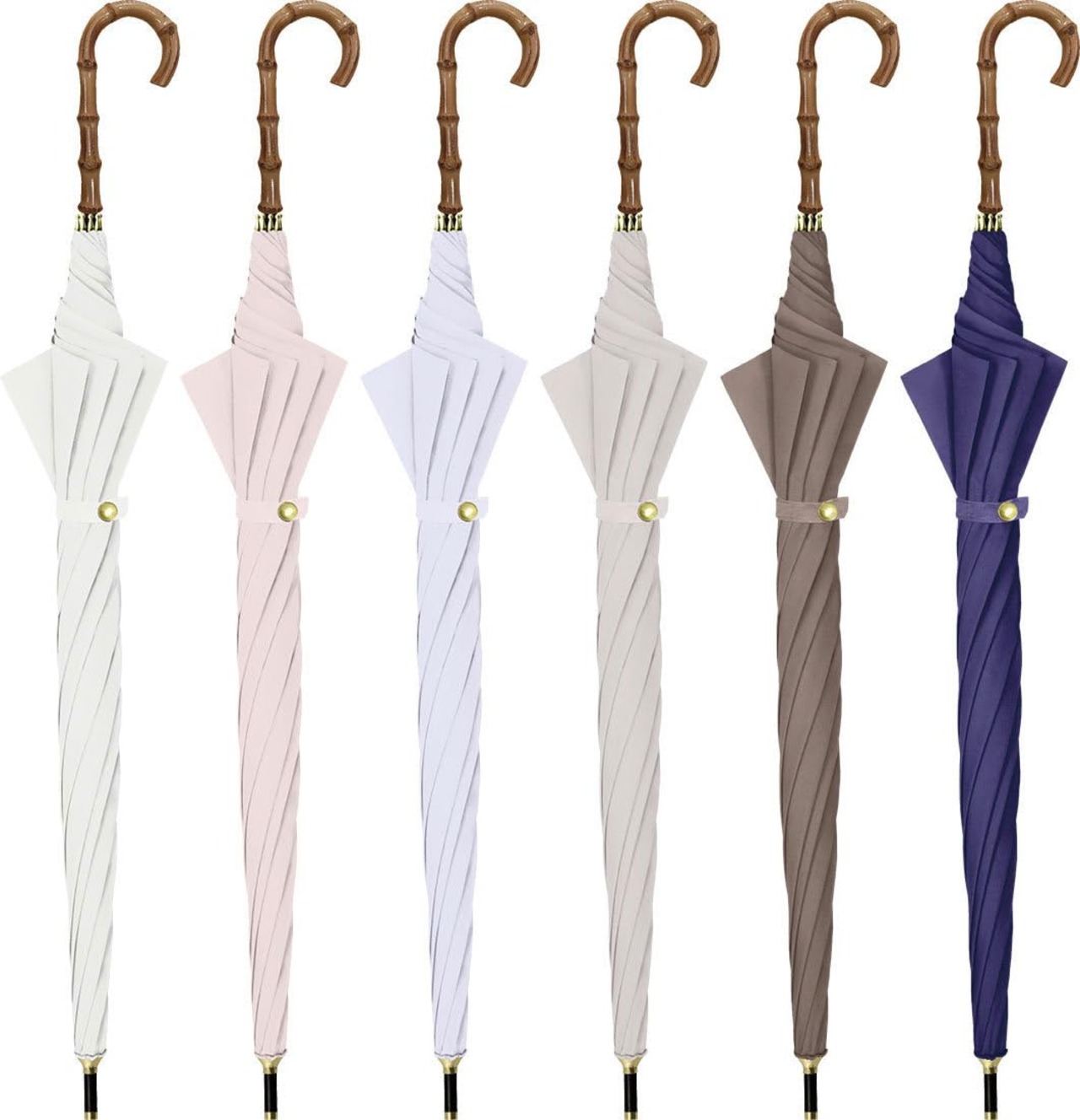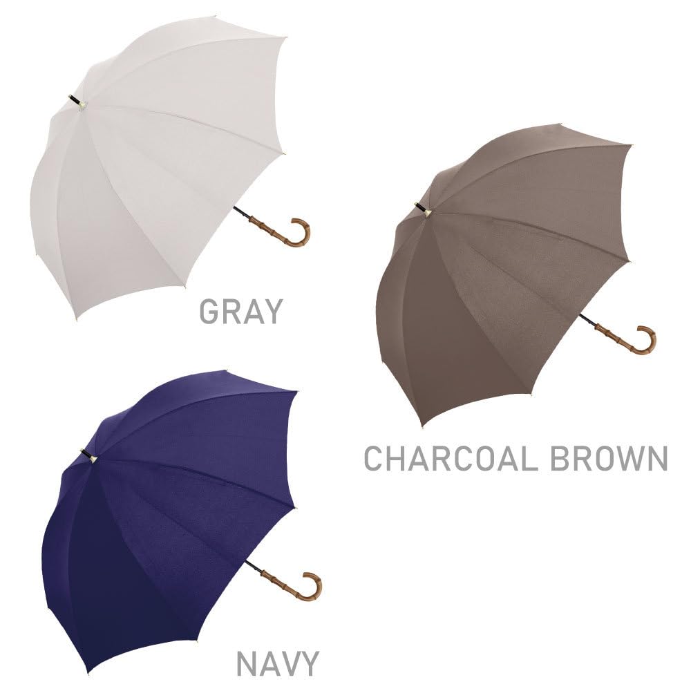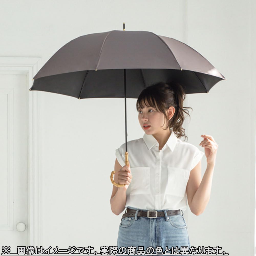 高級感のあるバンブー手元を使用。使いやすいベーシックカラーからトレンドのおしゃれカラーまで揃えました。親骨は、風に強くしなやかで折れにくいグラスファイバー骨仕様です。遮蔽率99.9%、遮熱効果30%cut、UPF50+、遮光率100%