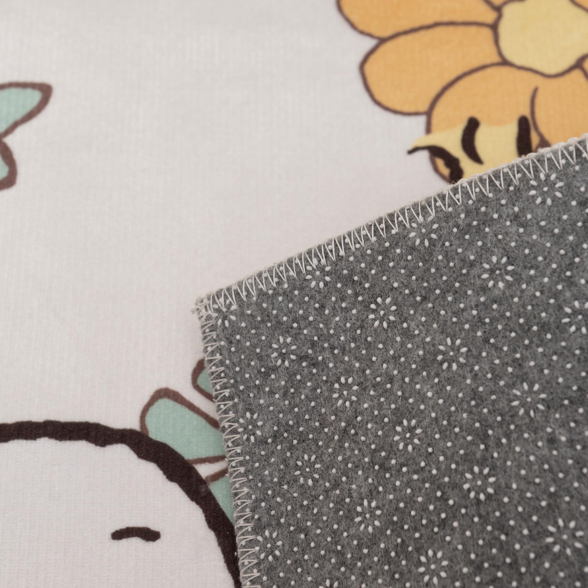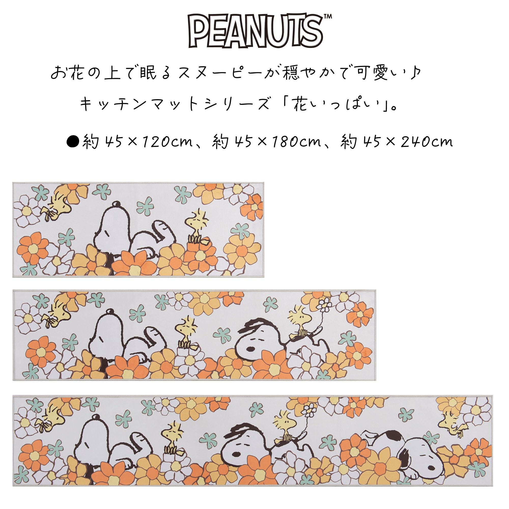 ゆったりした表情のスヌーピーと空間が華やぐお花モチーフで、気持ちが明るくなるデザイン。お花の上で眠るスヌーピーが穏やかで可愛い「花いっぱい」シリーズ。こちらは約45×120cmサイズです。さまざまな寝そべりポーズのスヌーピーがゆったり、ほっこりした気持ちにさせてくれます。裏面には滑りにくい加工が施されており、水周りでも安心してご使用いただけます。