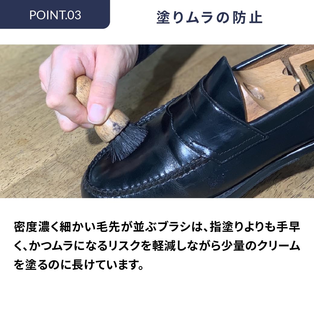 靴のお手入れの際に乳化性クリームを塗るのにはこれが最適です。 【布よりブラシが優れている理由】 (1)ブラシの方がクリームを全体的にまんべんなく伸ばしやすい。 (2)手を汚さずに効率的に作業ができる。 (3)コバの部分やメダリオン、革のシボ(シワ)など布では届かない部分までクリームを塗り、詰らない様にかき出す事ができる。 (4)布にクリームを取ると布自身にクリームが吸収されてしまい適量を確実に塗ることができない 【使い方】 クリームを米粒で3、4粒分程度ペネトレィトブラシに取り、靴に薄く広げていきます。スピーディーにクリームを全体に広げながら、コバの部分もしっかりとクリームを塗りこむ要領で浸透させます。