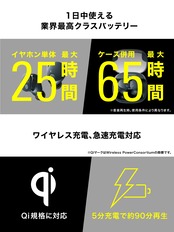 1日中使える、業界最高クラスバッテリー:ノイズキャンセリングOFF時では、イヤホンだけで最大25時間の連続再生が可能なため、 電池切れを心配することなく音楽や動画やSNSを1日中楽しむことができます。また、ノイズキャンセリングON時でも最大15時間、充電ケースを併用すれば最大66時間の連続再生が可能です。