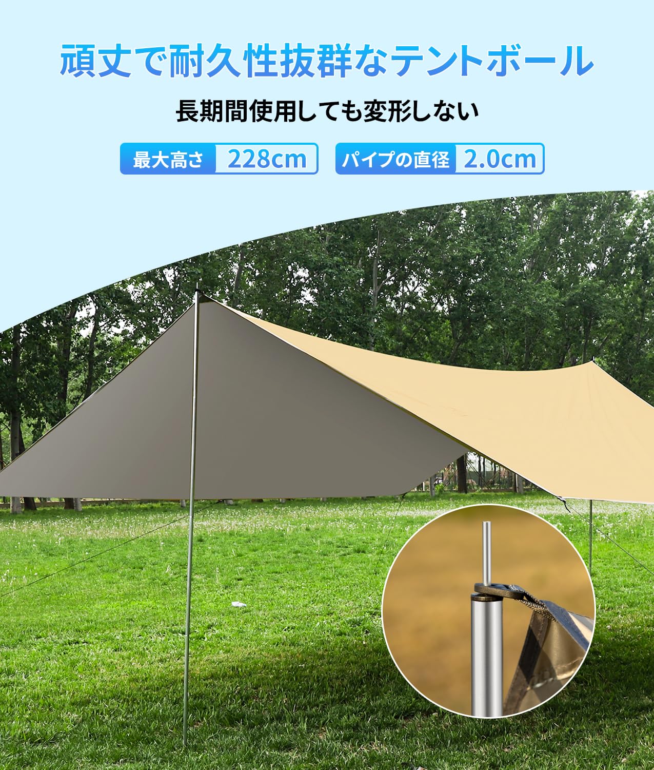 キャンプタープは高さ調節可能なポール付きです:キャンプタープには、高さを17インチから90インチまで調節可能なポールが2本付属しています。ポールの高さや位置を調整することで、異なる形状の日陰を得ることができます。