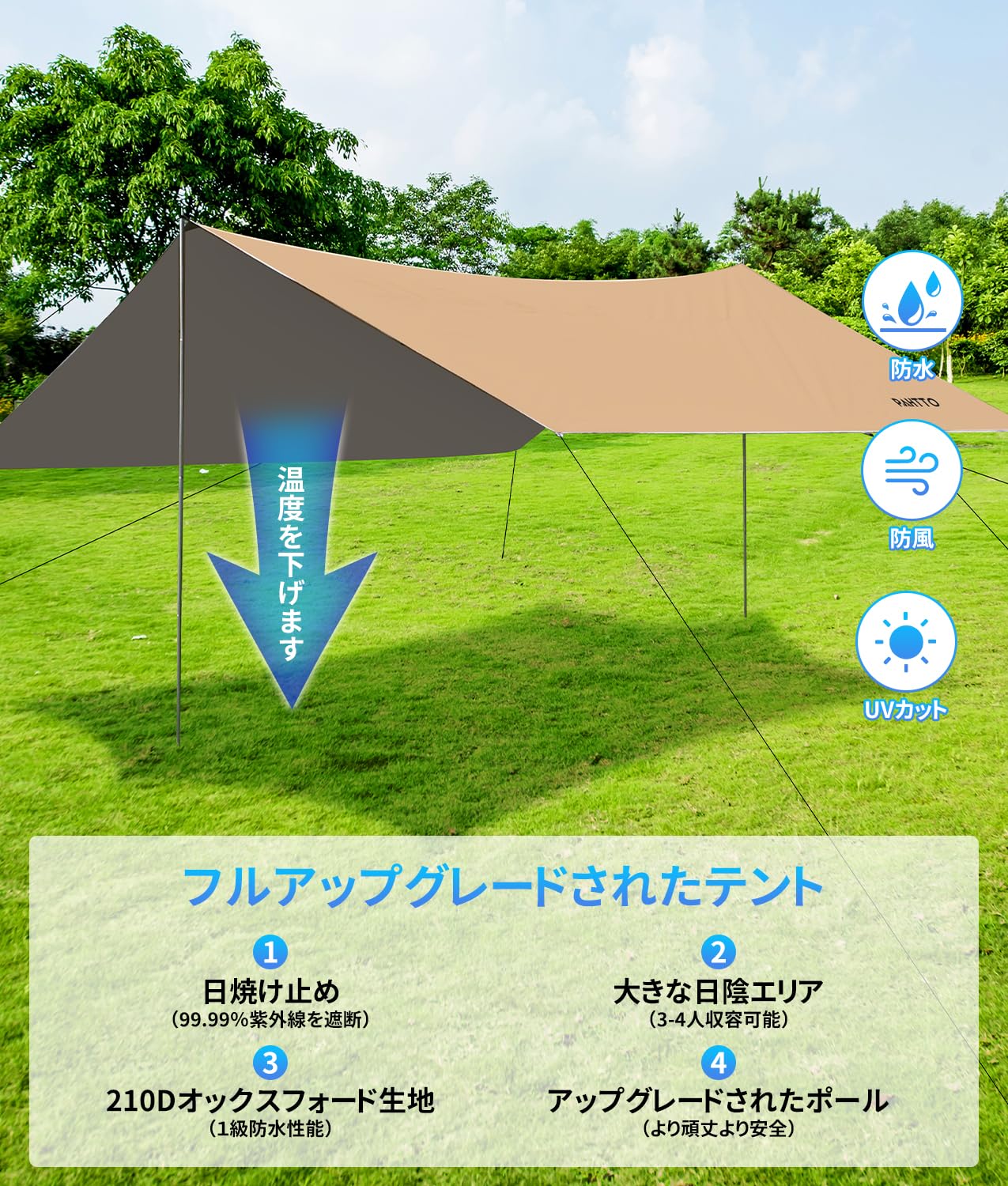 耐久性と超軽量と携帯性: テントタープは210Tポリエステル生地で作られており、軽量でありながらも頑丈であり、摩耗、穿孔、裂けを防ぎます。タープとポール、その他のアクセサリーは、付属の質の高い収納袋に収納でき、コンパクトで持ち運びに便利です。