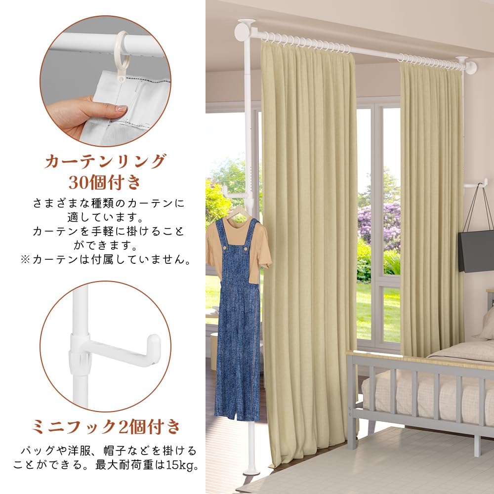 様々な用途:ミニフックが2つ付いており、この突っ張りパーテーションにバッグや洋服、帽子などを簡単に掛けることができます。カーテンポールつっぱり式は、部屋の間仕切り、子供部屋、洗濯物干し、ハンガーラックに使用できます。空間を区切り、スペースを有効活用し、あなたのプライバシーを守ります