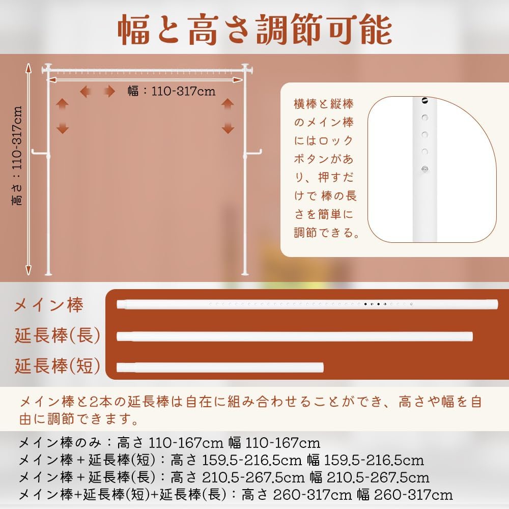 縦横伸縮可能:横棒と縦棒のメイン棒と延長棒の本数によって、カーテンレール突っ張り式の高さと幅を調節できます。また、メインバーのロックボタンを押すことで、ポールの長さを簡単に調節できる。メイン棒のみ:110-167cm、メイン棒+延長棒(短):159.5-216.5cm、メイン棒+延長棒(長):210.5-267.5cm、メイン棒+延長棒(短)+延長棒(長):260-317cm