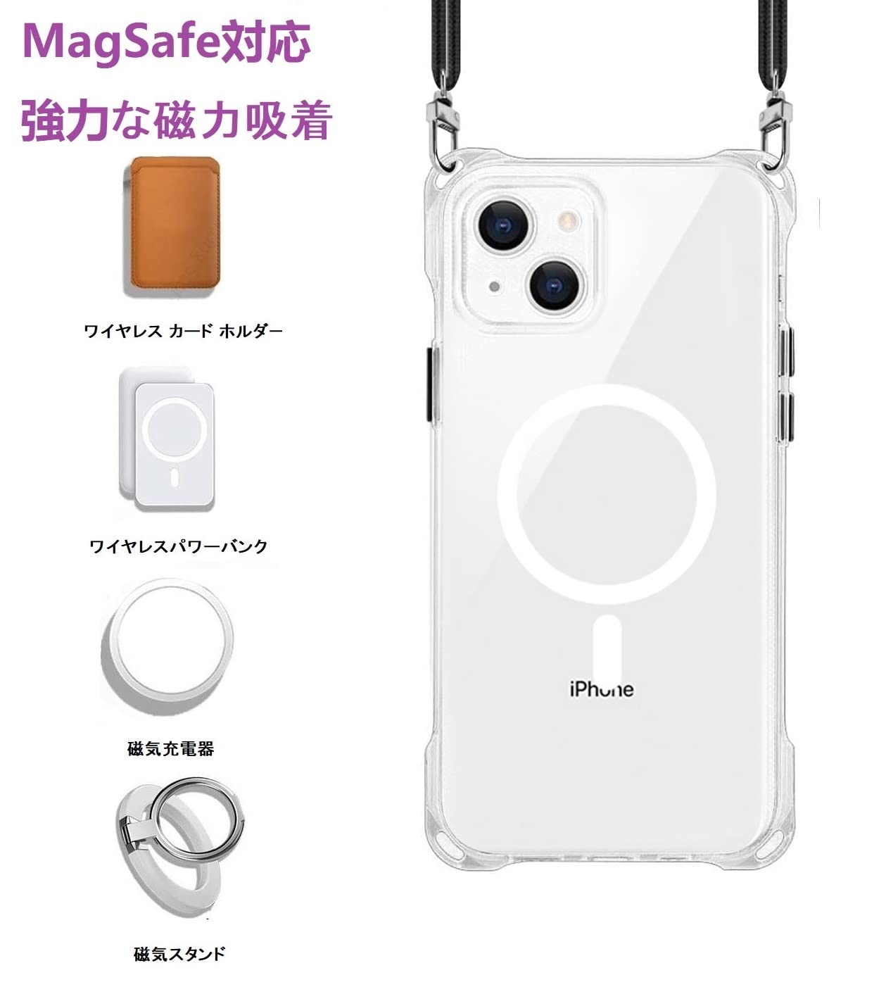 【新春セール】MagSafe対応 iPhone 13 用 ケース クリア ストラップ ショルダー マグネット搭載 HILEGENERアイフォン13 カバー 肩掛け 斜めかけ 縄掛けケース【ブラック縄掛け付き】 カメラレンズ保護 紐付き 斜めがけ 織りスト ネックストラップ ショルダー ケース 縦/横 2WAY 長さ調整可能 取り外し可能 落下防止 紛失防止 ワイヤレス充電対応 (あいほん13-クリア)