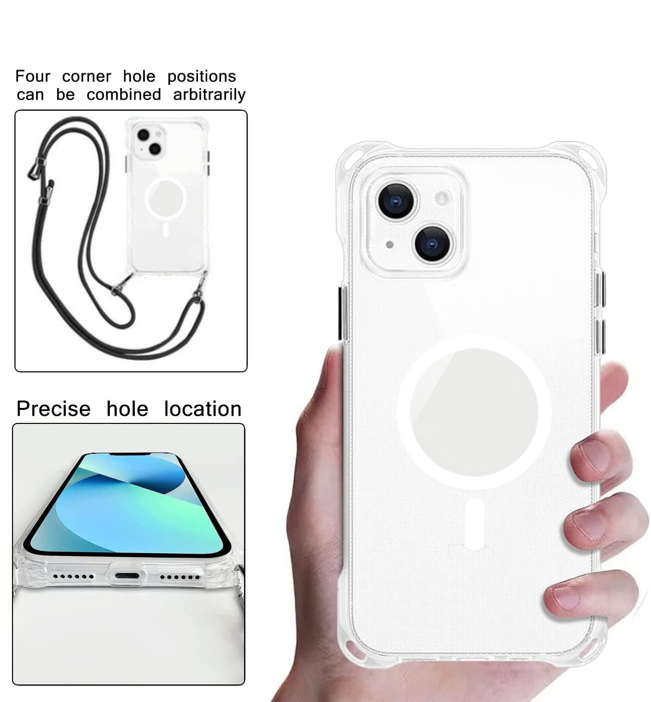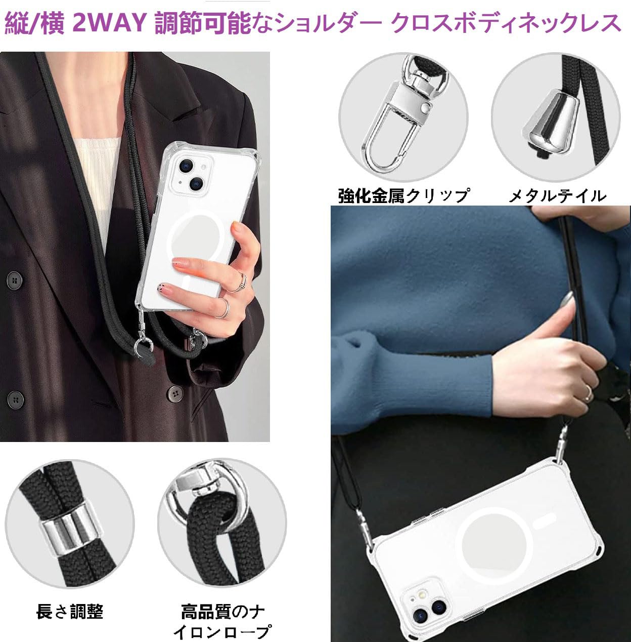 MagSafe対応 iPhone 13 用 ケース クリア ストラップ ショルダー マグネット搭載 HILEGENERアイフォン13 カバー 肩掛け 斜めかけ 縄掛けケース【ブラック縄掛け付き】 カメラレンズ保護 紐付き 斜めがけ 織りスト ネックストラップ ショルダー ケース 縦/横 2WAY 長さ調整可能 取り外し可能 落下防止 紛失防止 ワイヤレス充電対応 (あいほん13-クリア)