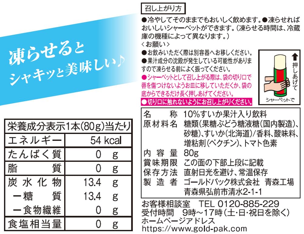 糖類(果糖ぶどう糖液糖(国産製造)、砂糖)、すいか(北海道)/香料、酸味料、増粘剤(ペクチン)、トマト色素
