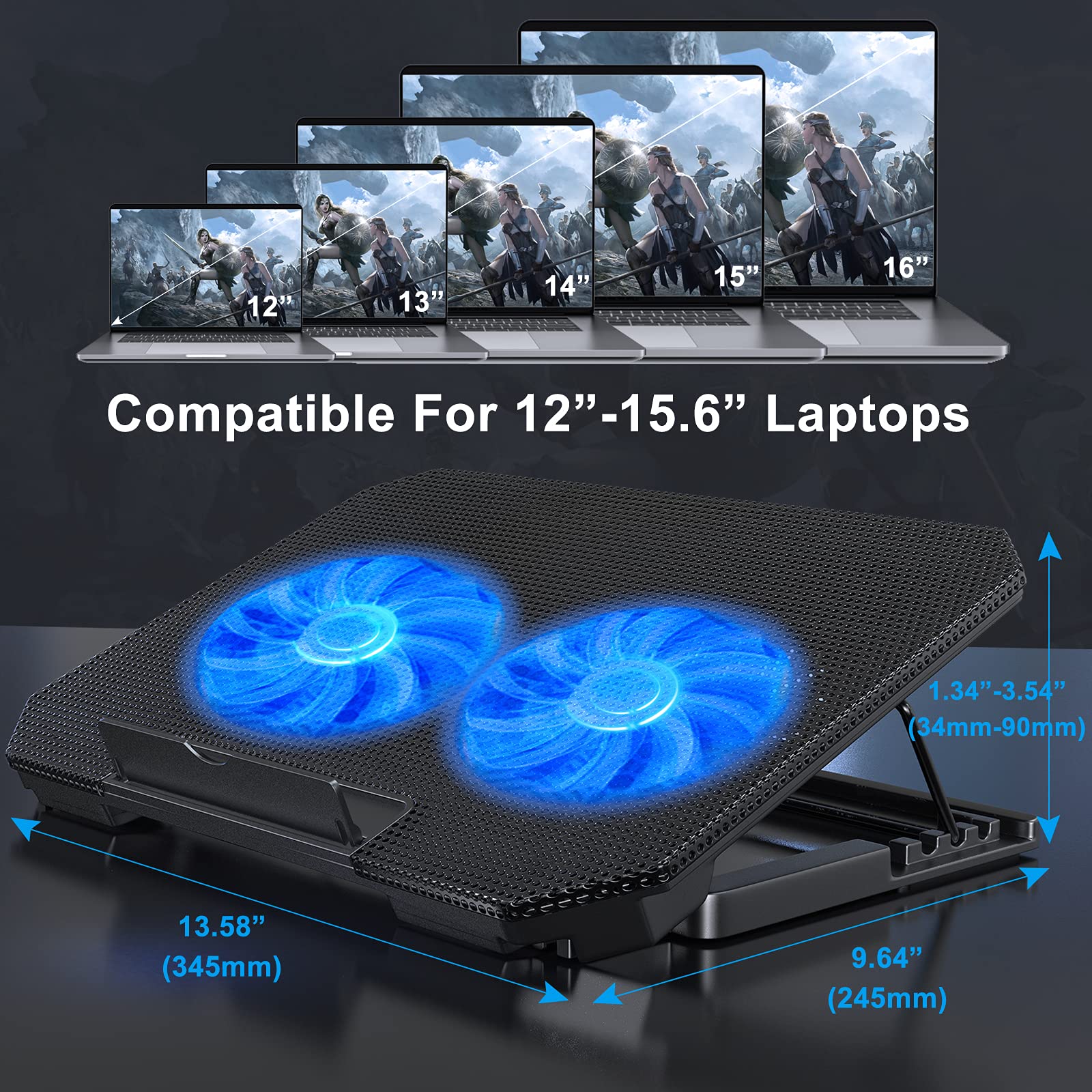 【デュアルエフェクトファン】ノートパソコン冷却スタンドは、5インチ(12.8cm)、ファン音量:5-15dB、ブルーLEDライト付きファン。ランプビーズ輝度:10LM、動作電圧:5V、電流:0.22A、USBケーブル長:60cm、スピードは800-2000RPMの間で自由に調整可能。