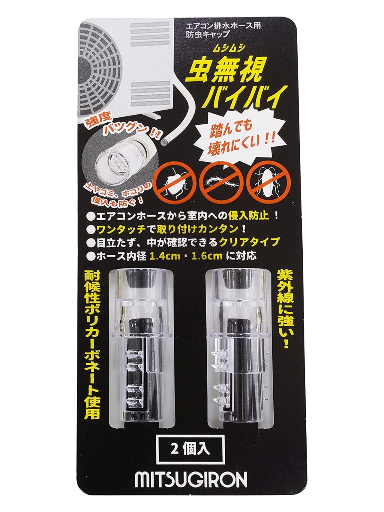 ミツギロン(Mitsugiron) エアコン排水ホース用 防虫キャップ クリア 2個入 室外機 エアコンホース 侵入防止 紫外線に強い ワンタッチ取り付け 虫無視バイバイ ST-23