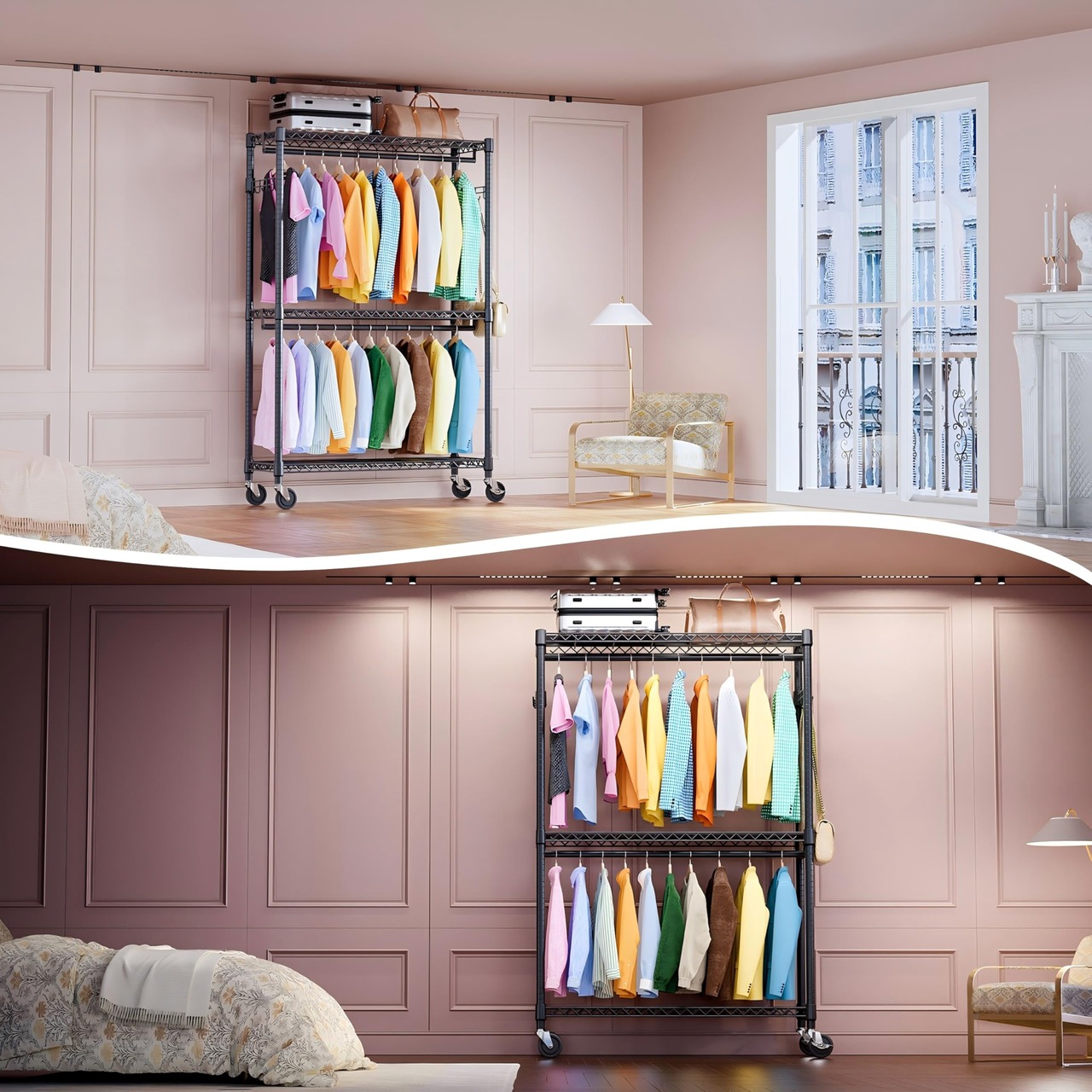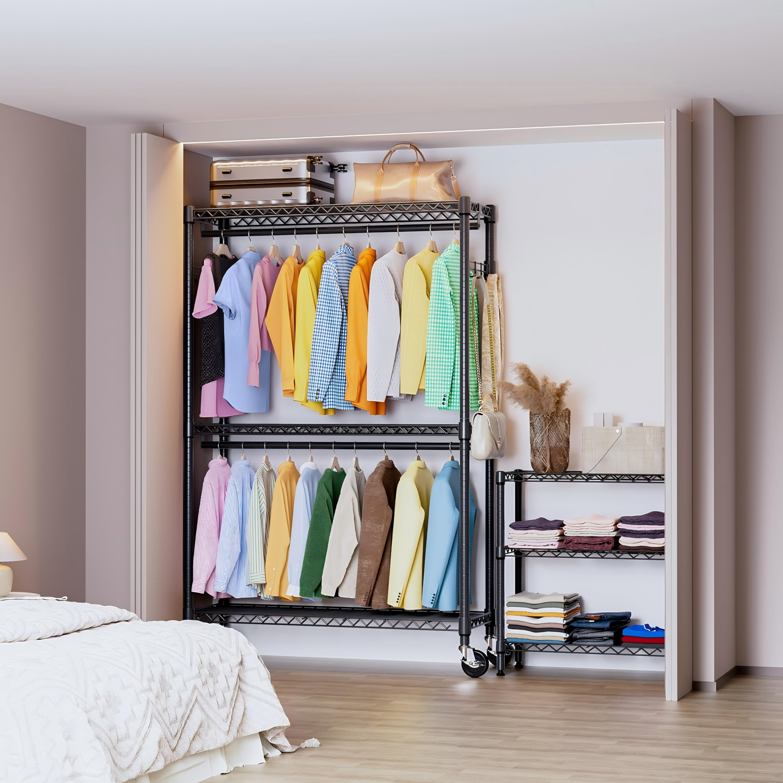 【多くの場所に適用可能】衣類ラックは万能で、玄関、リビング、バスルーム、ガレージ、ランドリールーム、廊下、バルコニー、ベッドルーム、クローク、ショールームのクローゼットなどと互換性があります。